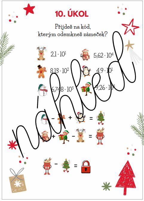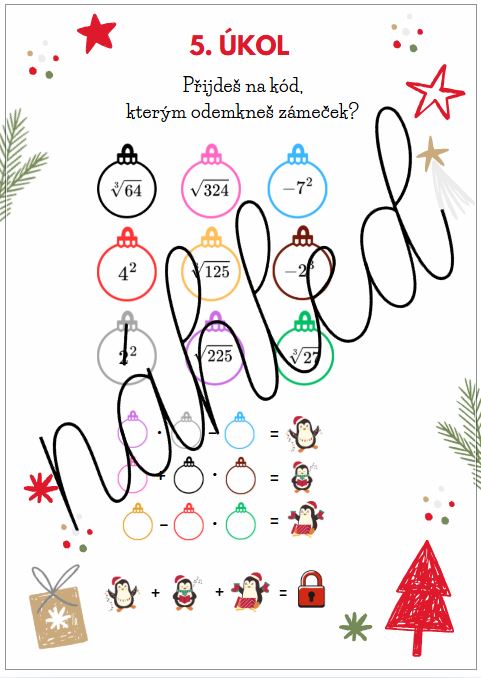 Žáci budou řešit matematické úkoly zaměřené na výpočty s mocninou a odmocninou. Každý úkol má číselný výsledek, který si žáci zapisují. Na konci je čeká závěrečný úkol (18. úkol), ve kterém všechna získaná čísla využijí k odhalení kontrolního kódu. Ten mohou buď nahlásit učiteli, nebo jím odemknout zámeček s odměnou.