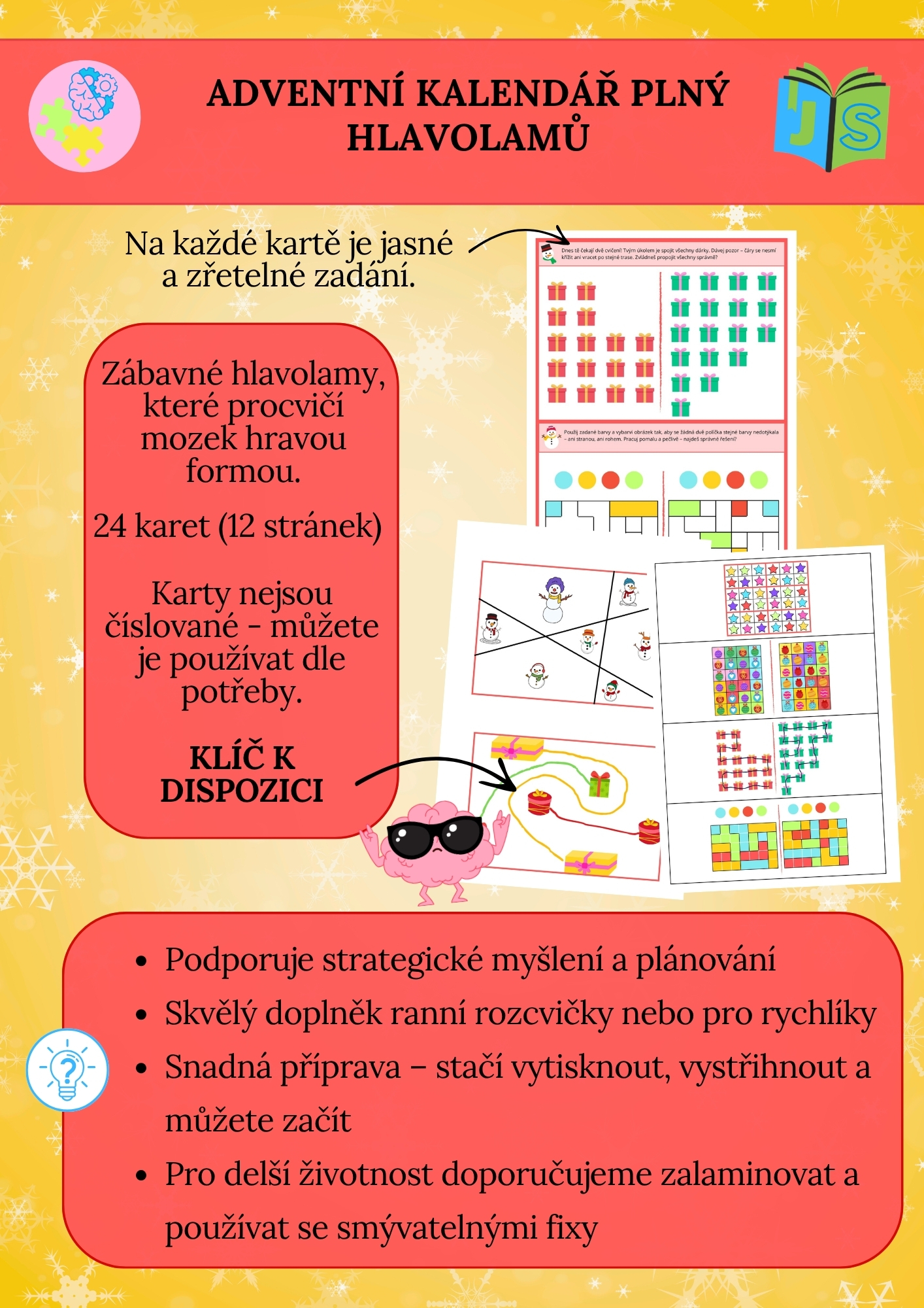 Oživte předvánoční výuku pomocí adventního kalendáře plného hlavolamů! Tento soubor obsahuje 24 originálních karet plných logických a vizuálních úkolů s vánoční tématikou, které jsou ideální do hodin během prosince, na ranní rozcvičky, centra aktivit, pro rychlíky nebo jako zimní pracovní listy. Žáci si zábavnou formou procvičí logické myšlení, soustředění, vizuální vnímání, strategii i kritické uvažování.