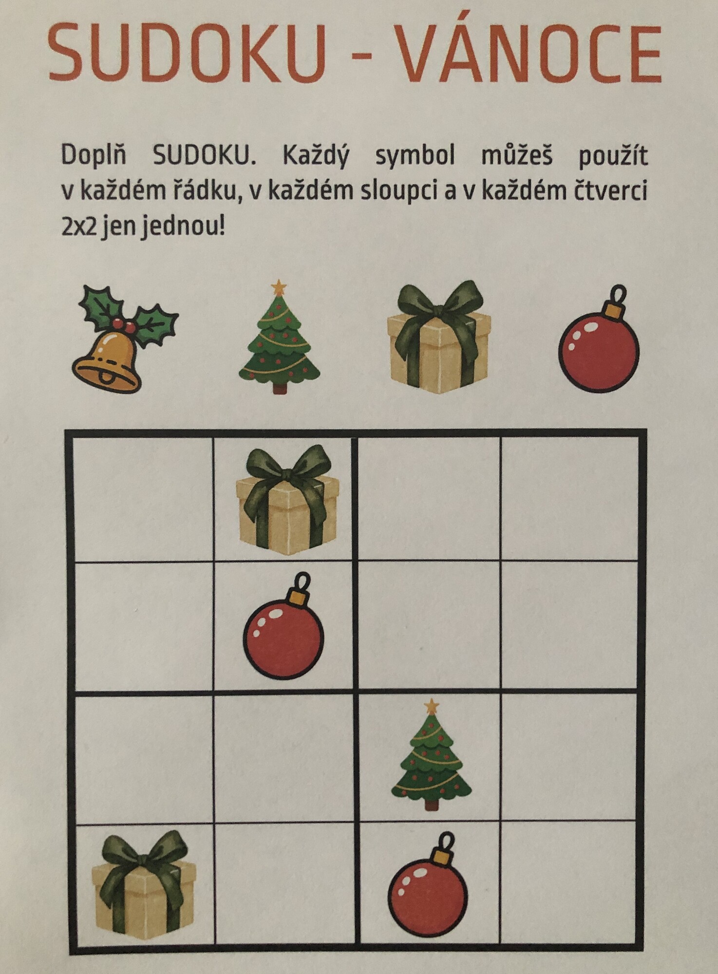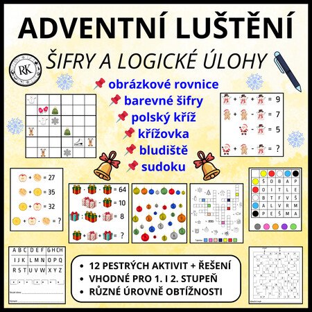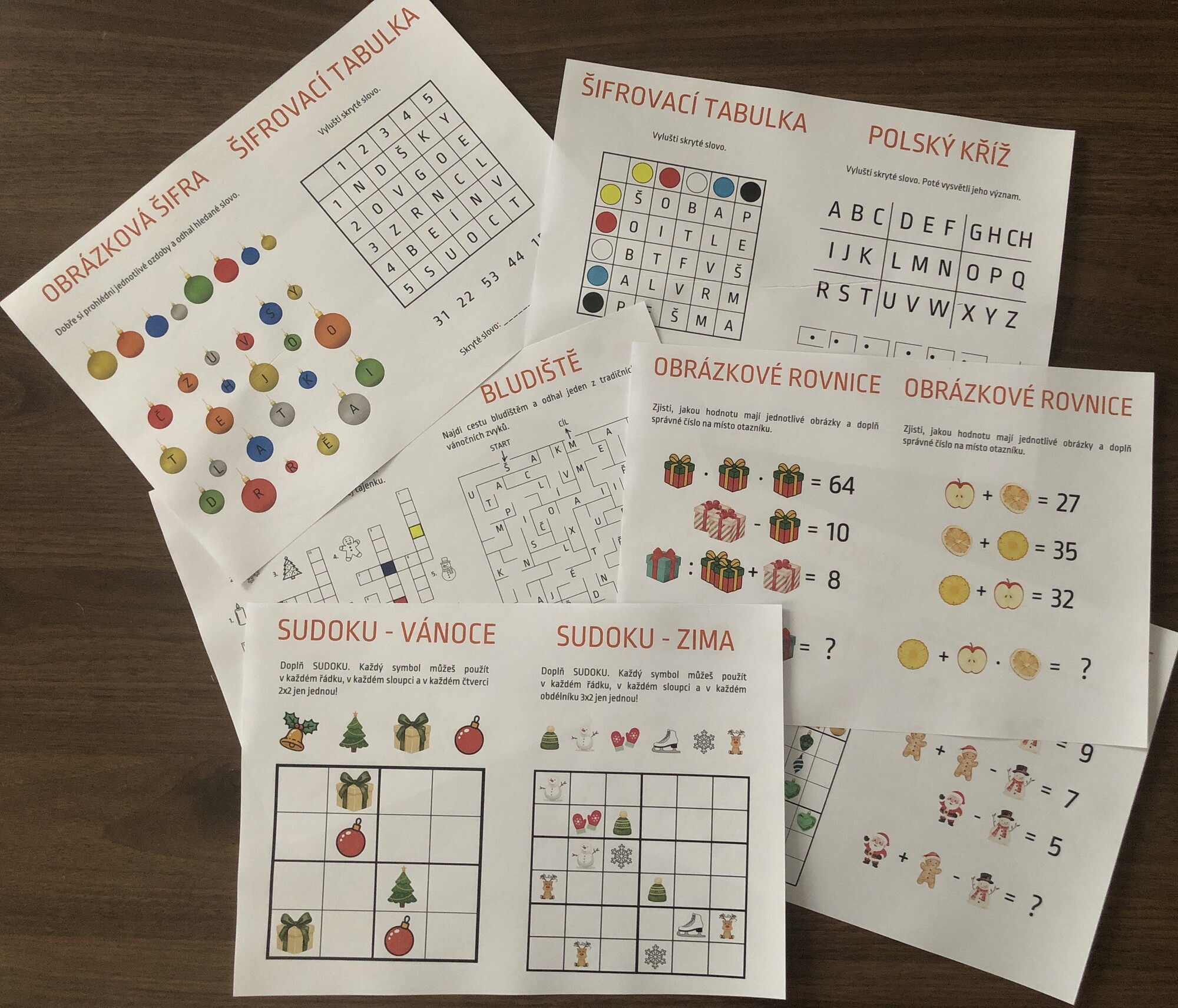 Vzdělávací materiál obsahuje 12 různorodých aktivit převážně s vánoční tematikou (některé aktivity jsou se zimní tematikou, takže je můžete využít i po Vánocích). Najdete zde např. obrázkové sudoku, obrázkové rovnice, barevné šifry, křížovku, bludiště nebo polský kříž.