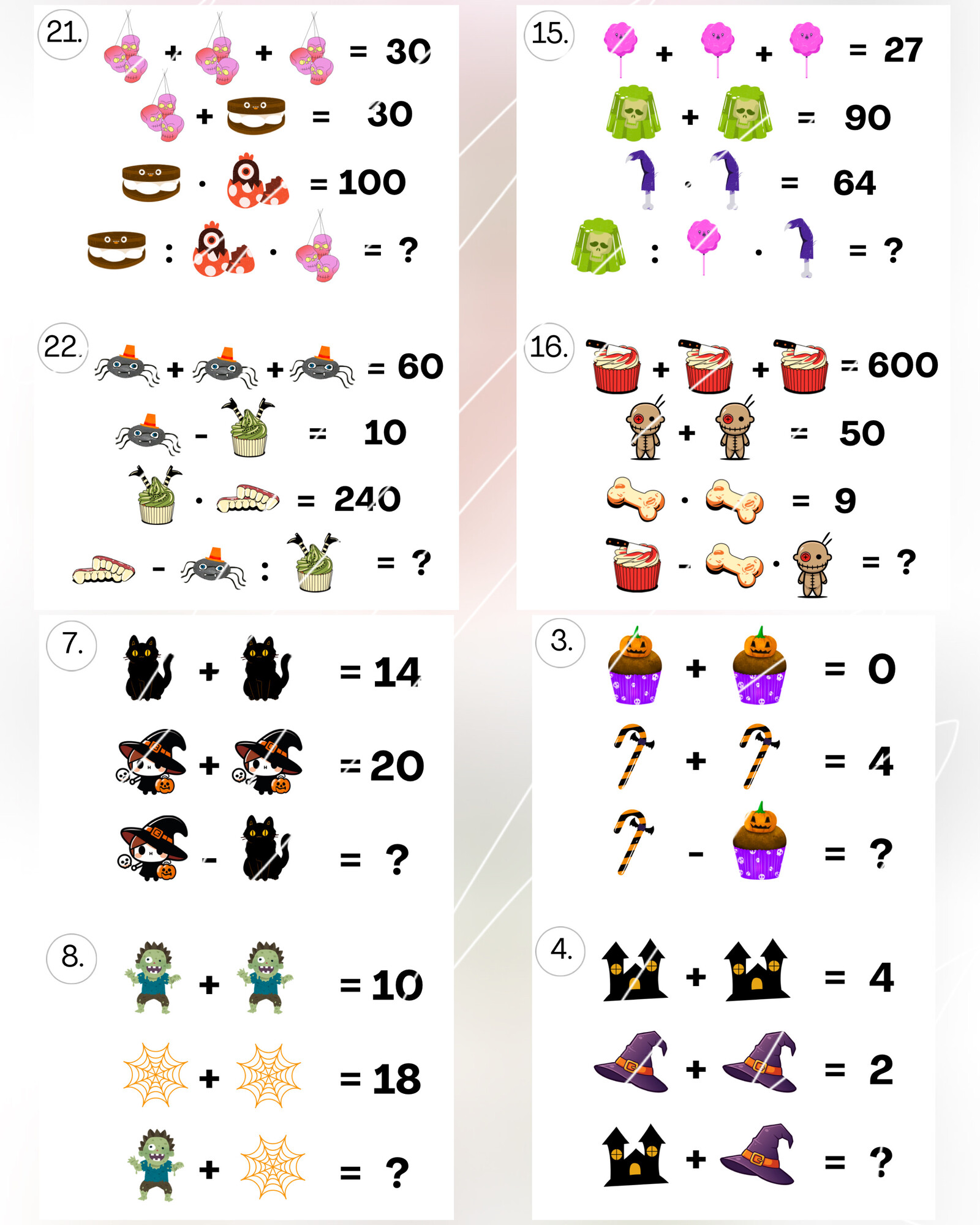 20 úloh (algebrogramů) rozdělených do 5 úrovní („tříd“) podle obtížnosti