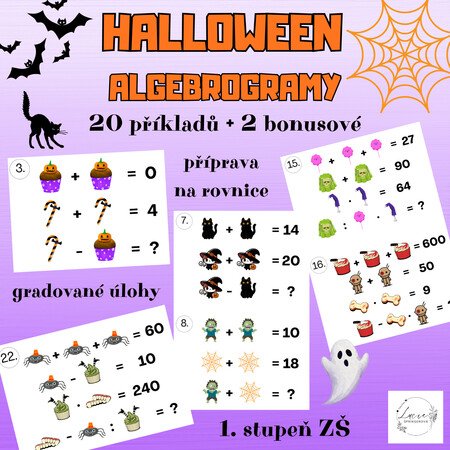 Soubor obsahuje 20 příkladů + 2 bonusové, gradované úlohy, příprava na rovnice, počítání s obrázky