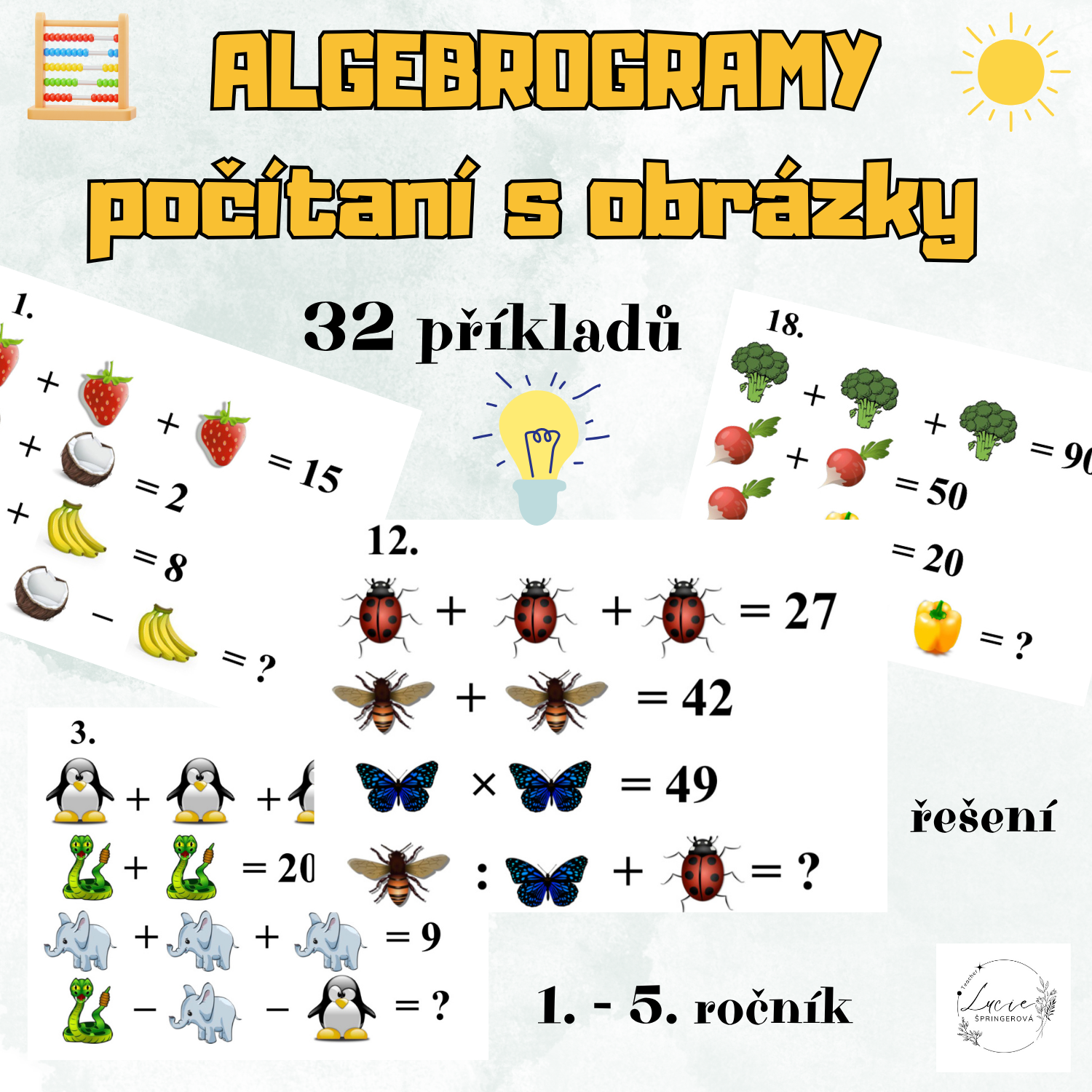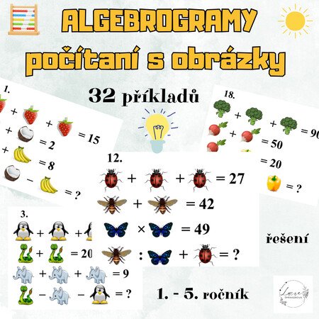 Počítání je rozděleno na 1. – 5. třídu, dohromady 32 příkladů + řešení. Rozvoj logického myšlení.