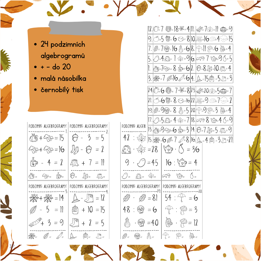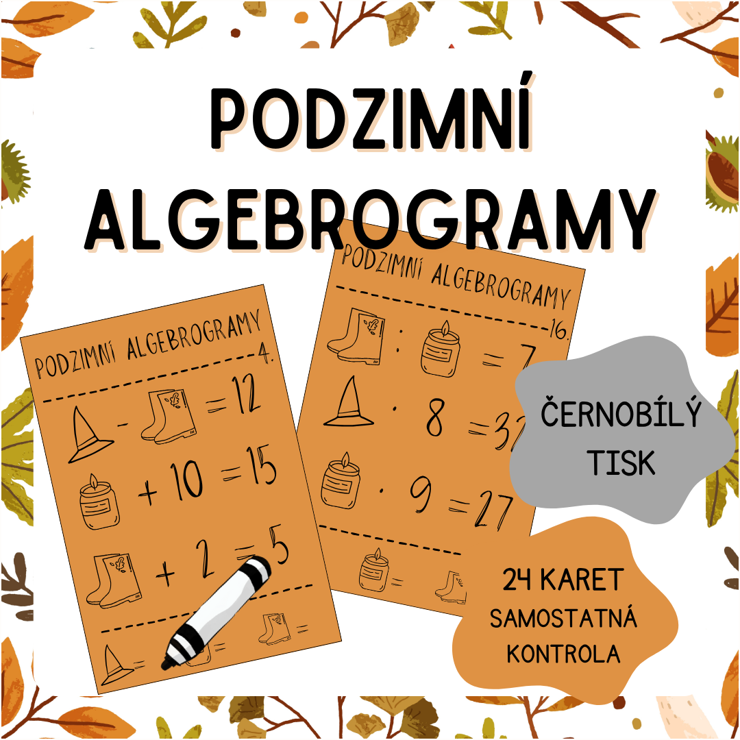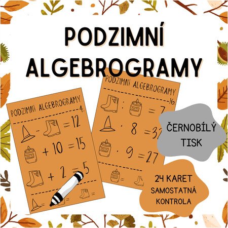 Následující materiál obsahuje 24 černobílých kartiček s podzimními algebrogramy. Algebrogramy jsou ve třech různých úrovních - 1-12 = sčítání a odčítání do 20, 13-24 = malá násobilka. Materiál je vhodný jako zpestření (nejen) podzimních hodin matematiky.