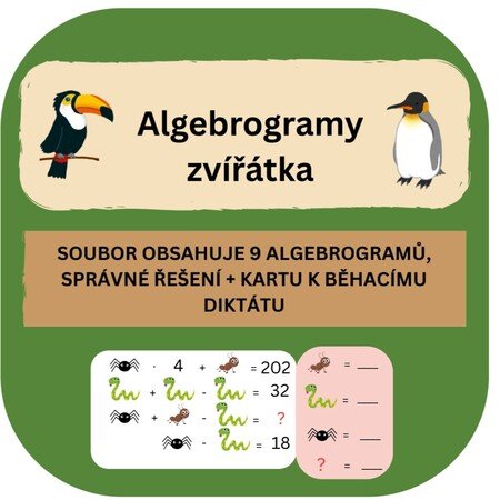 Materiál lze využít jako pracovní listy či běhací diktát. V souboru najdete 9 algebrogramů, správné řešení a kartu k běhacímu diktátu. Ideální pro rozvoj logického a matematického myšlení hravou formou.