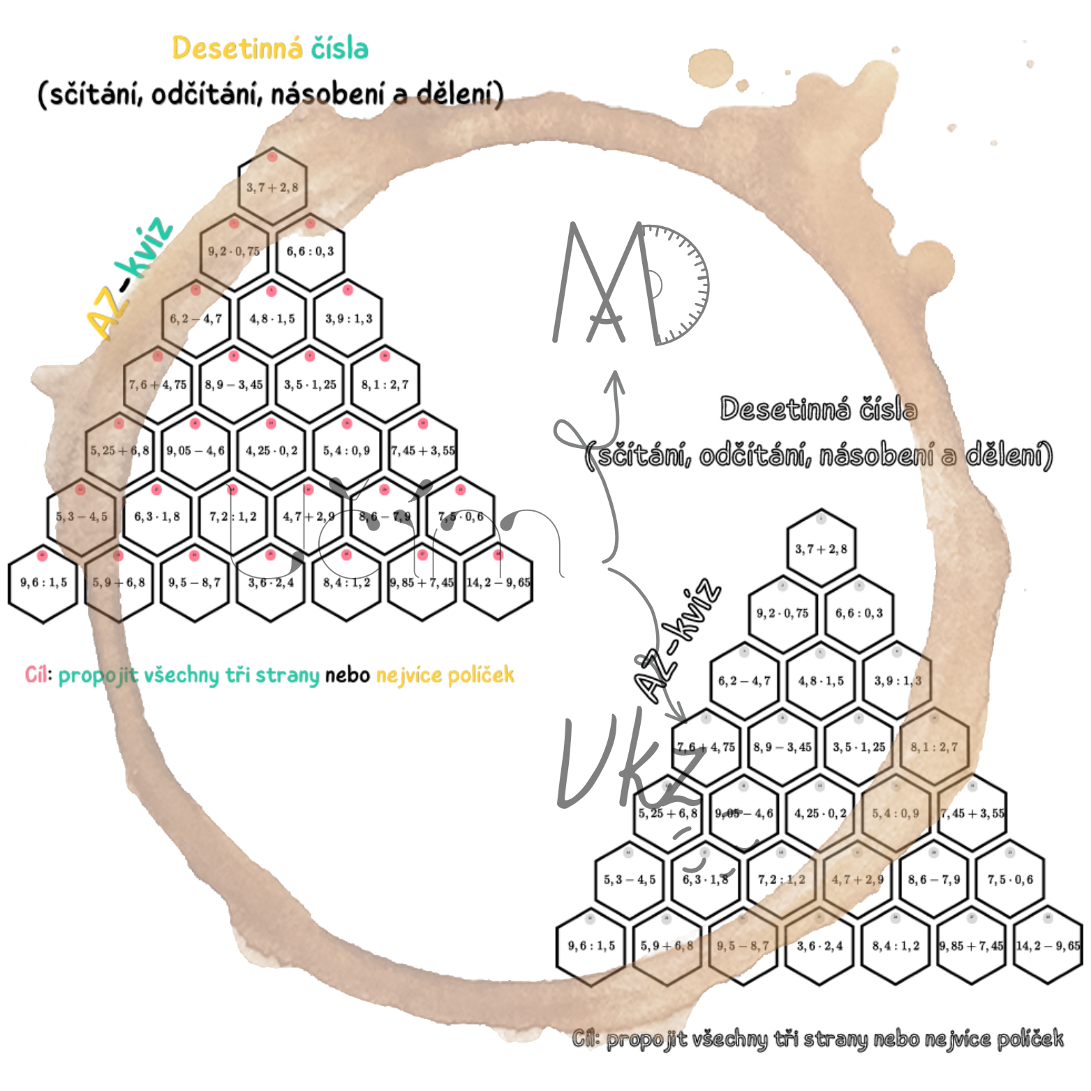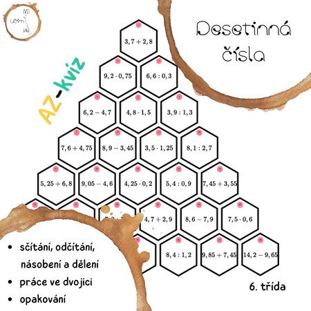 Materiál je určen pro žáky 2. stupeň ZŠ. Oblíbená televizní vědomostní soutěž AZ-kvíz a procvičování výpočtů desetinných čísel. Je připraveno celkem 28 příkladů na výpočty s desetinnými čísly (černobílá varianta).