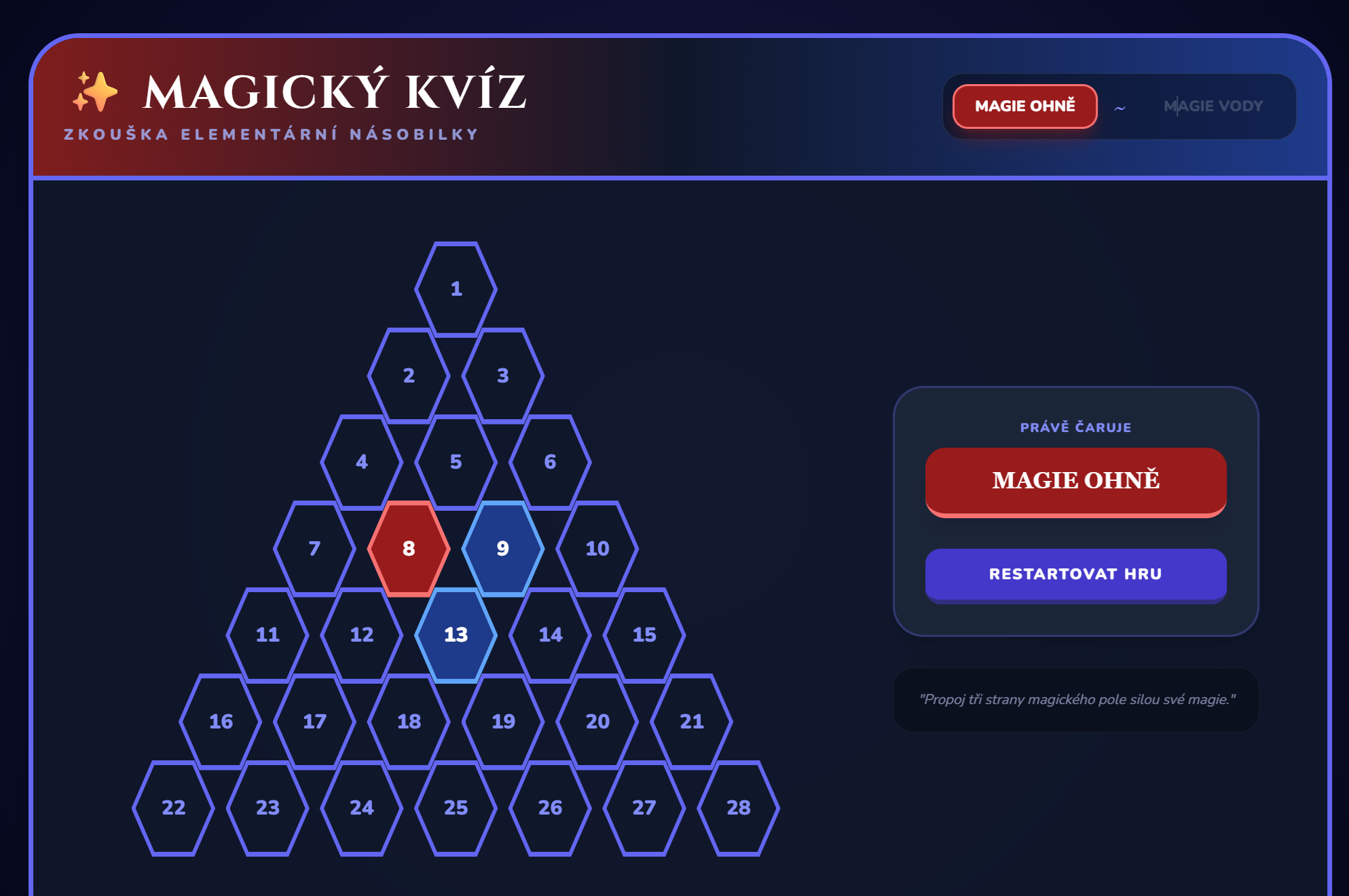 - Tematické zpracování: Celý design je laděn do magického stylu – používá kouzelnická písma, barvy dvou magických škol a zvukové efekty připomínající kouzlení (při výběru políčka nebo správné odpovědi).