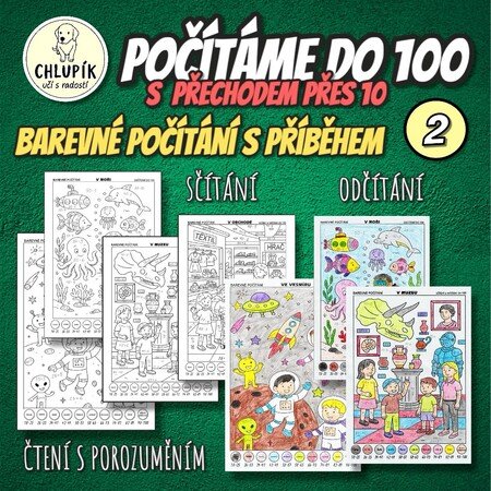 Pokračování barevné počítání pro zábavné procvičení sčítání a odčítání do 100 během matematiky. Na druhé straně najdete krátký příběh k obrázku a malý testík na čtení s porozuměním.