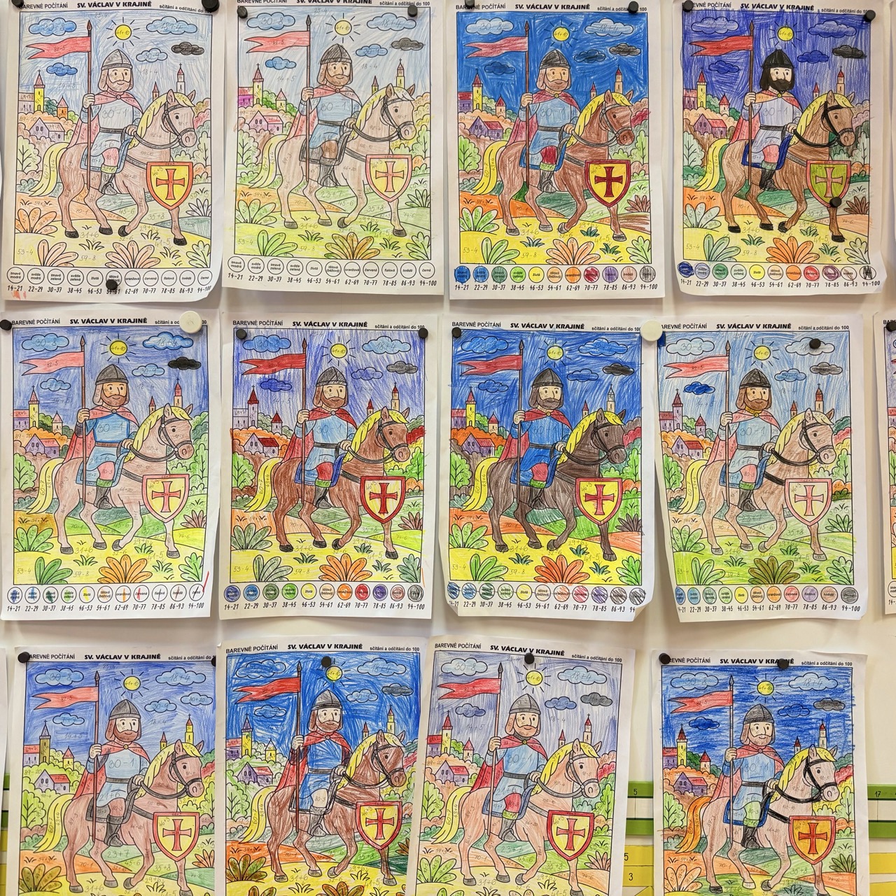 Barevné počítání tentokrát s tématem sv. Václava (v krajině, na náměstí, v katedrále a se svatováclavskou korunou) využívám v hodinách matematiky jako doplňkovou aktivitu. Na začátku hodiny děti nejprve počítají sloupeček příkladů na druhé straně, který slouží jako krátká pětiminutovka. Po jeho vypočítání se mohou pustit do vybarvování omalovánky. Každý pracuje vlastním tempem, takže jsou všechny děti stále zaměstnány. Jakmile mají všichni sloupeček vypočítaný, společně provedeme kontrolu.