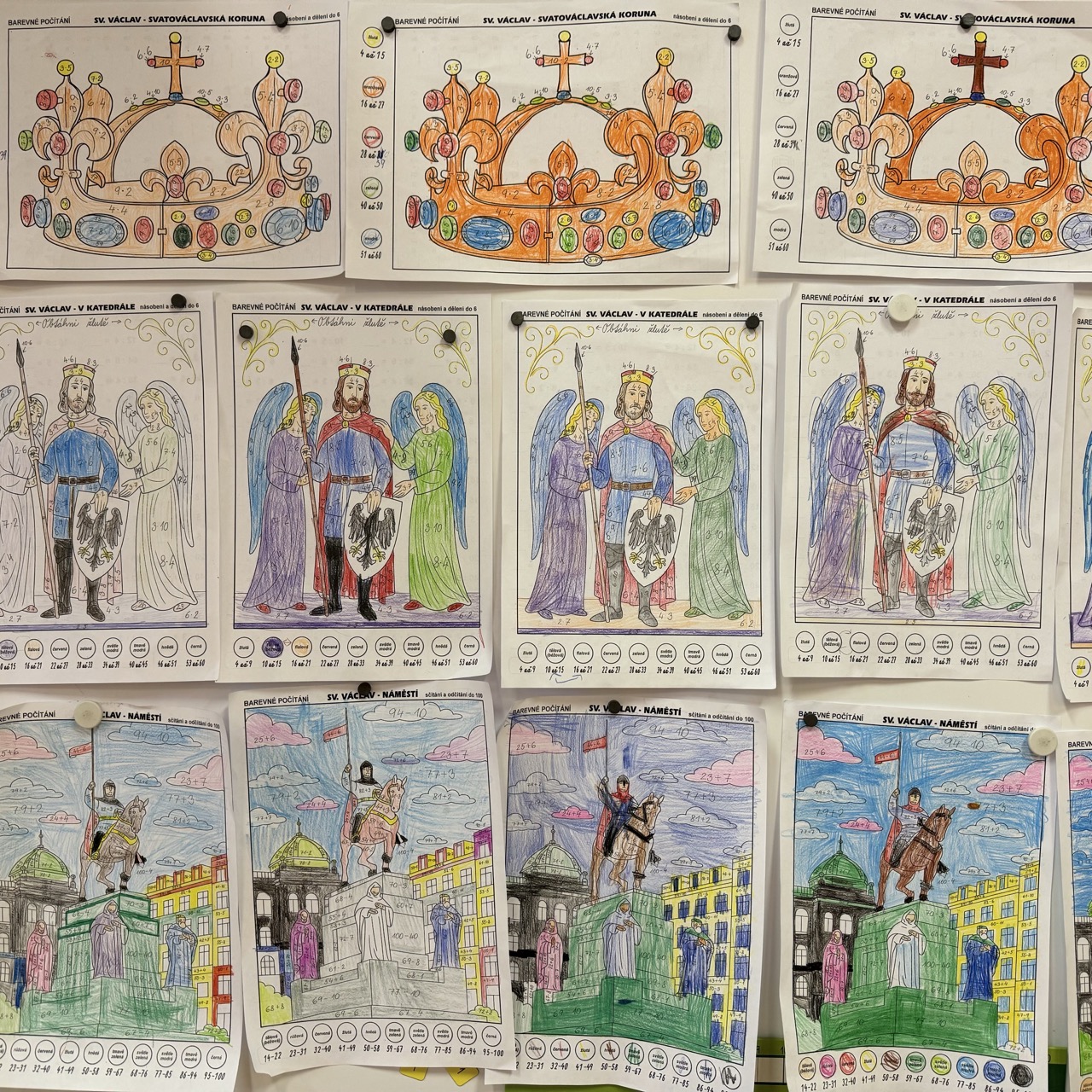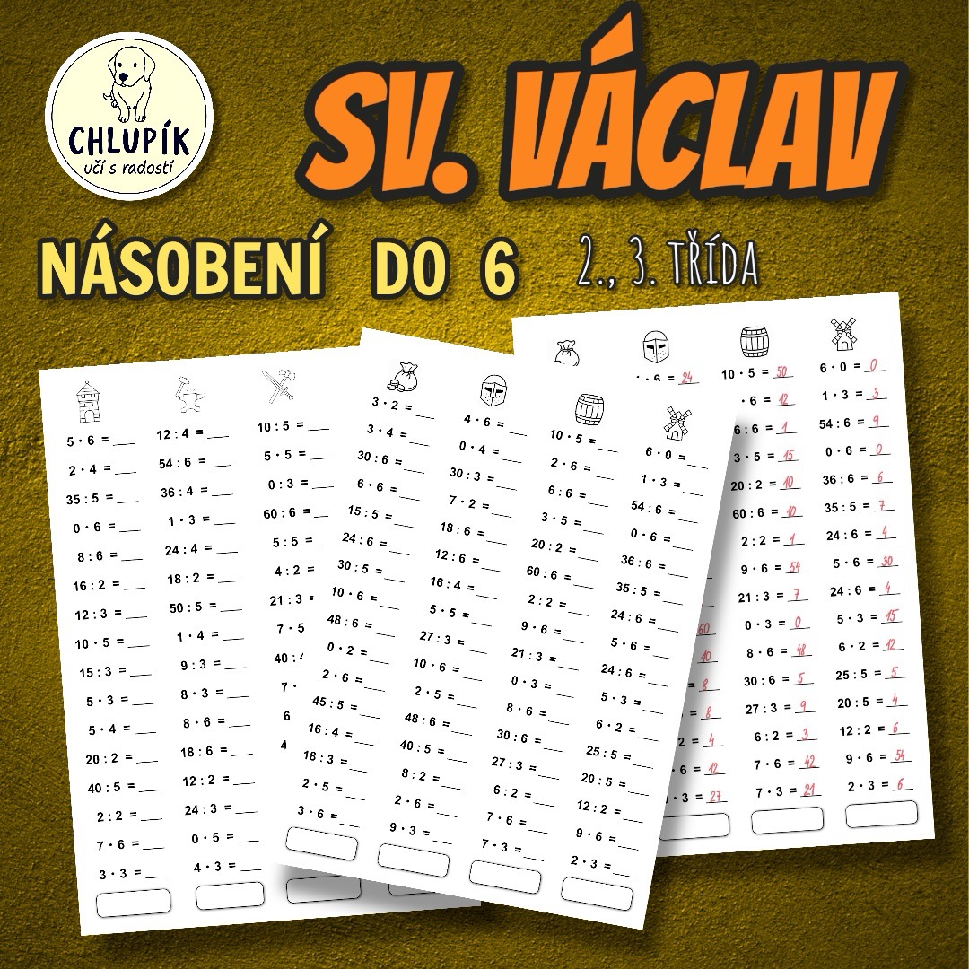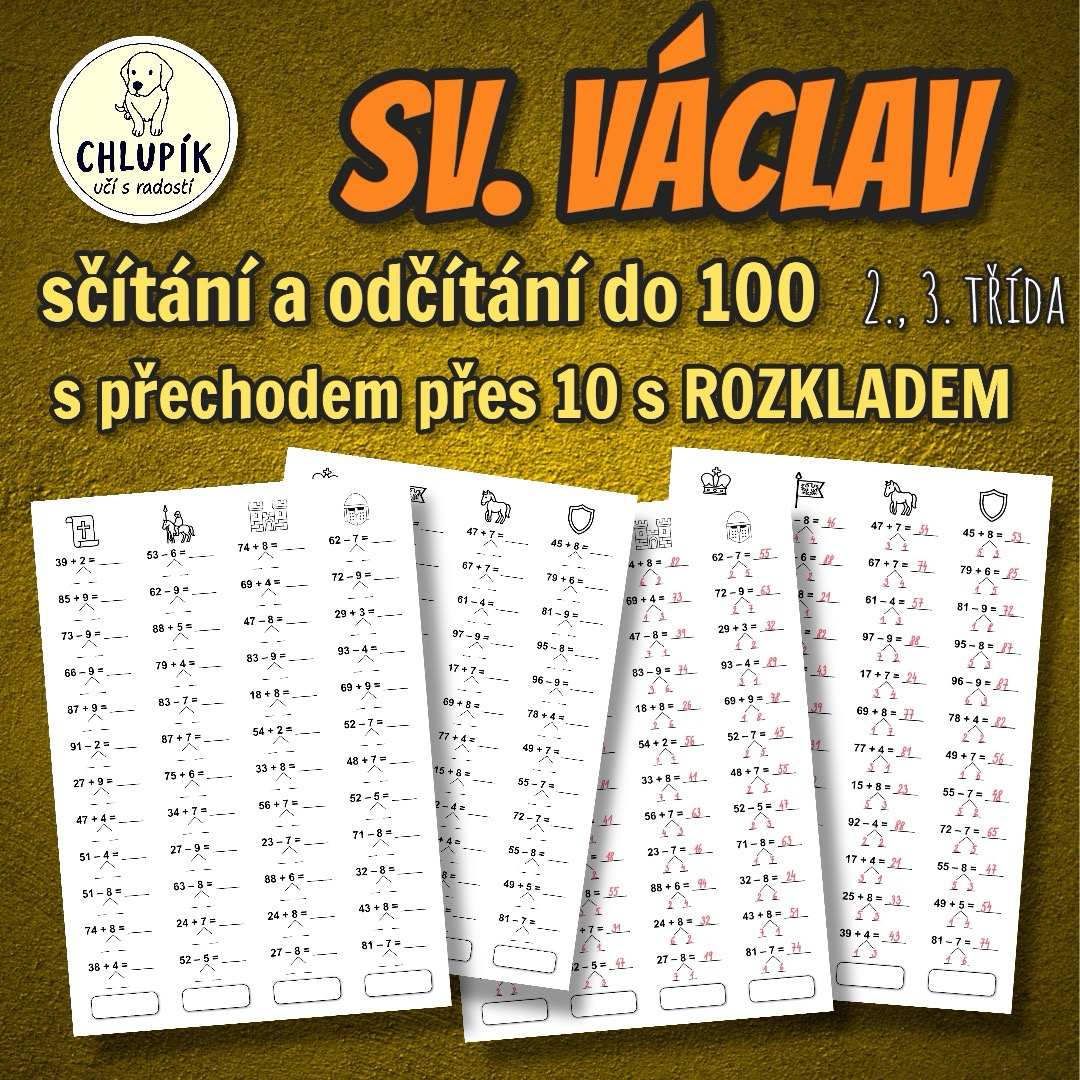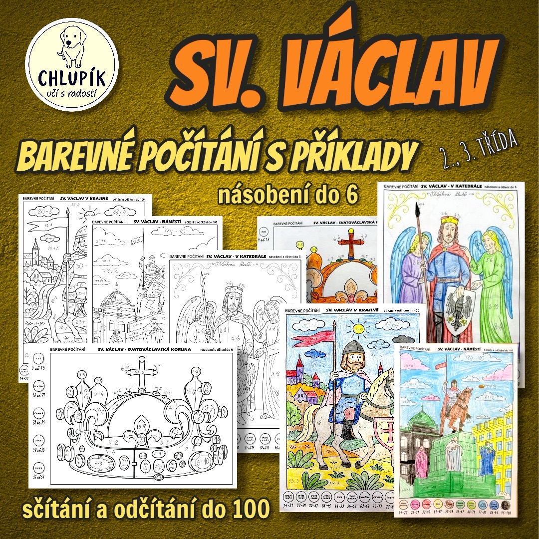 Svatý Václav a barevné počítání pro zábavné procvičení sčítání a odčítání do 100 a násobení v oboru násobků 0–6. Na druhé straně najdete příklady se sčítáním, odčítáním s rozkladem i s násobením.