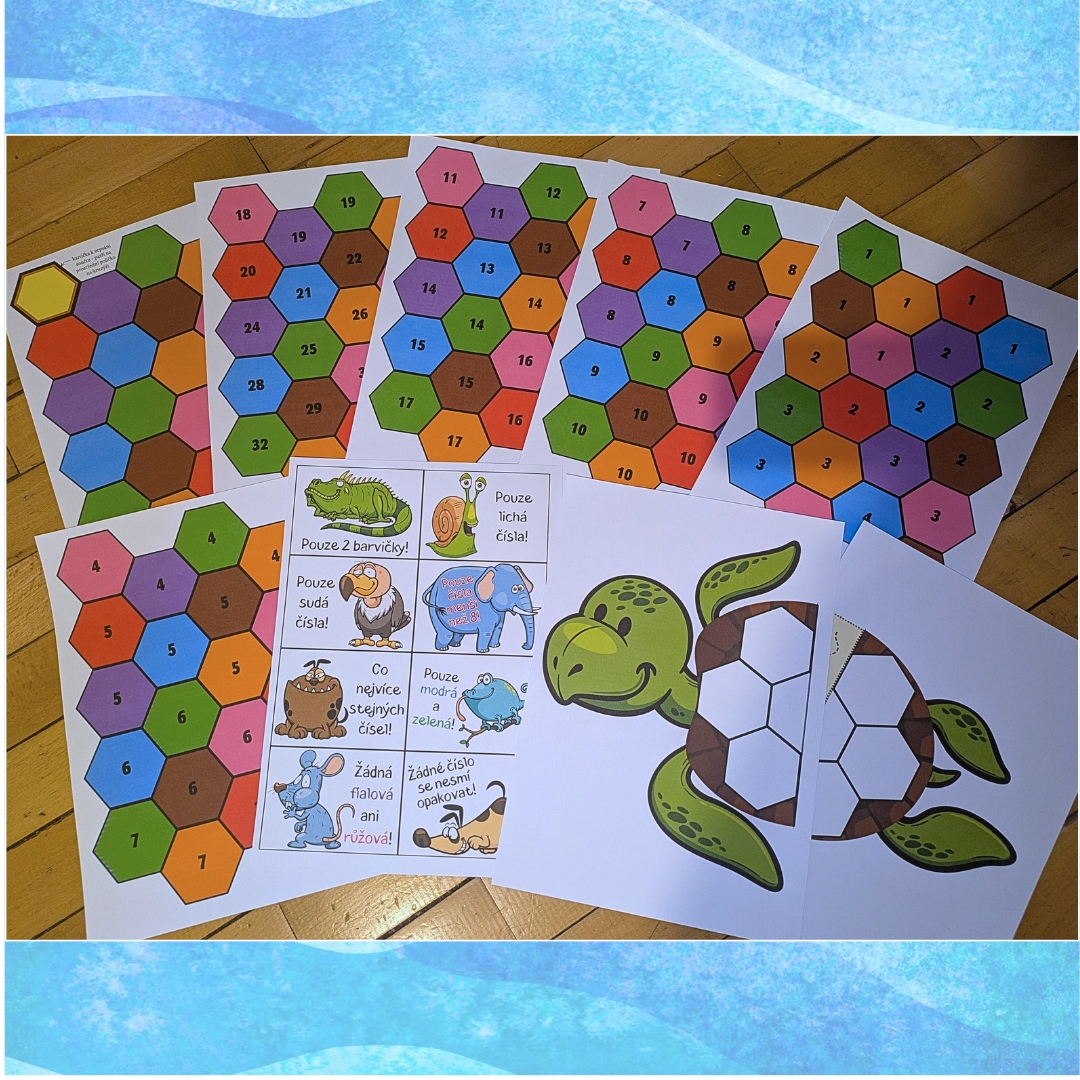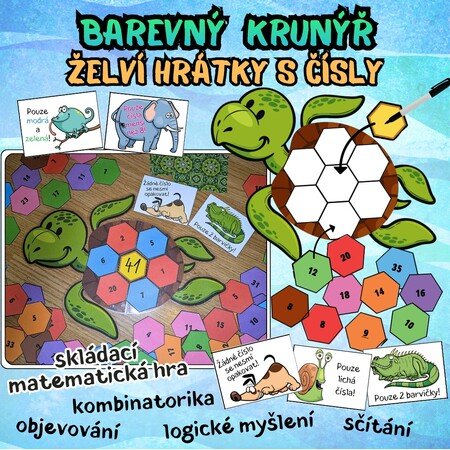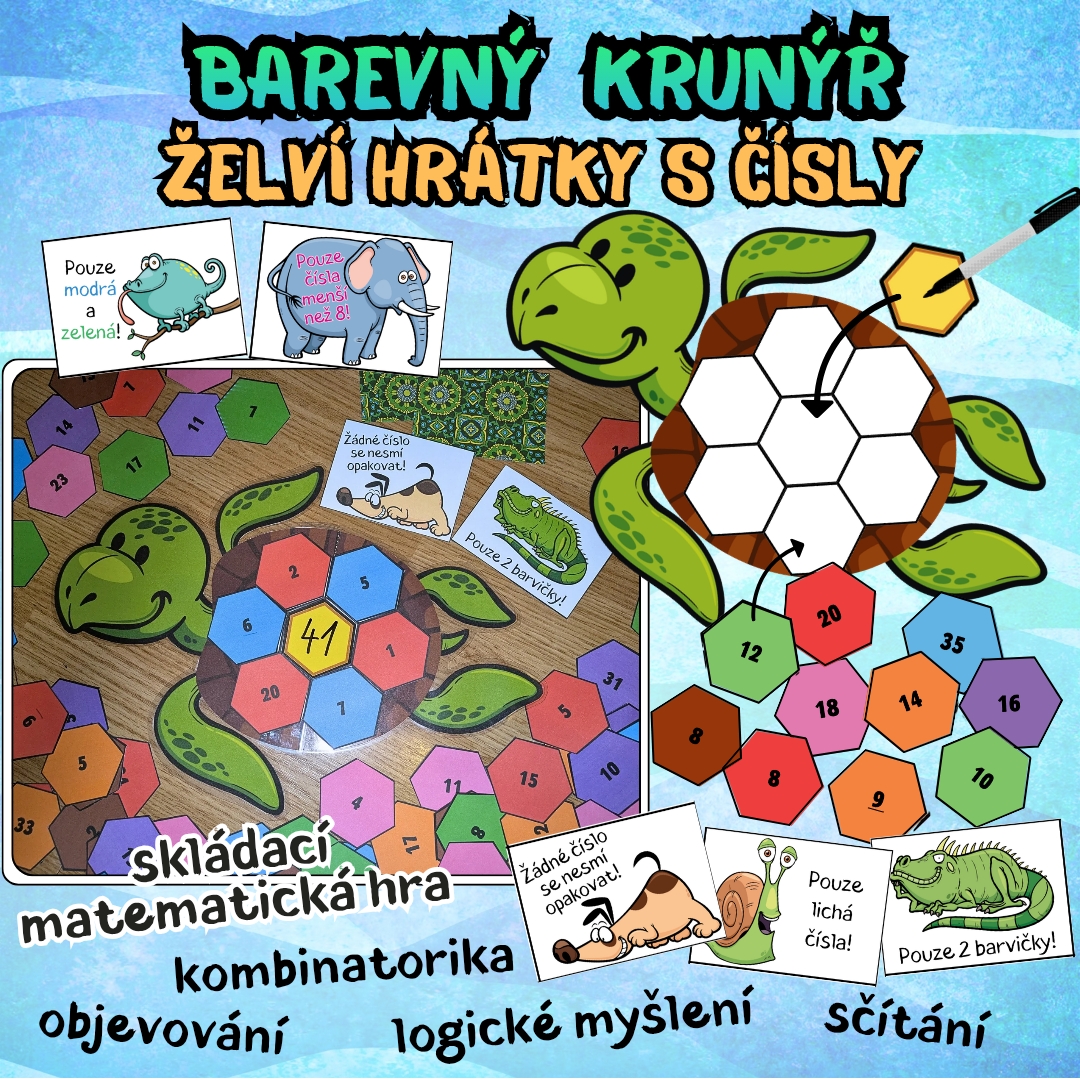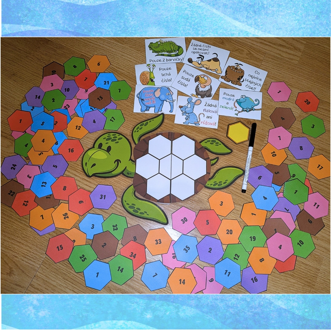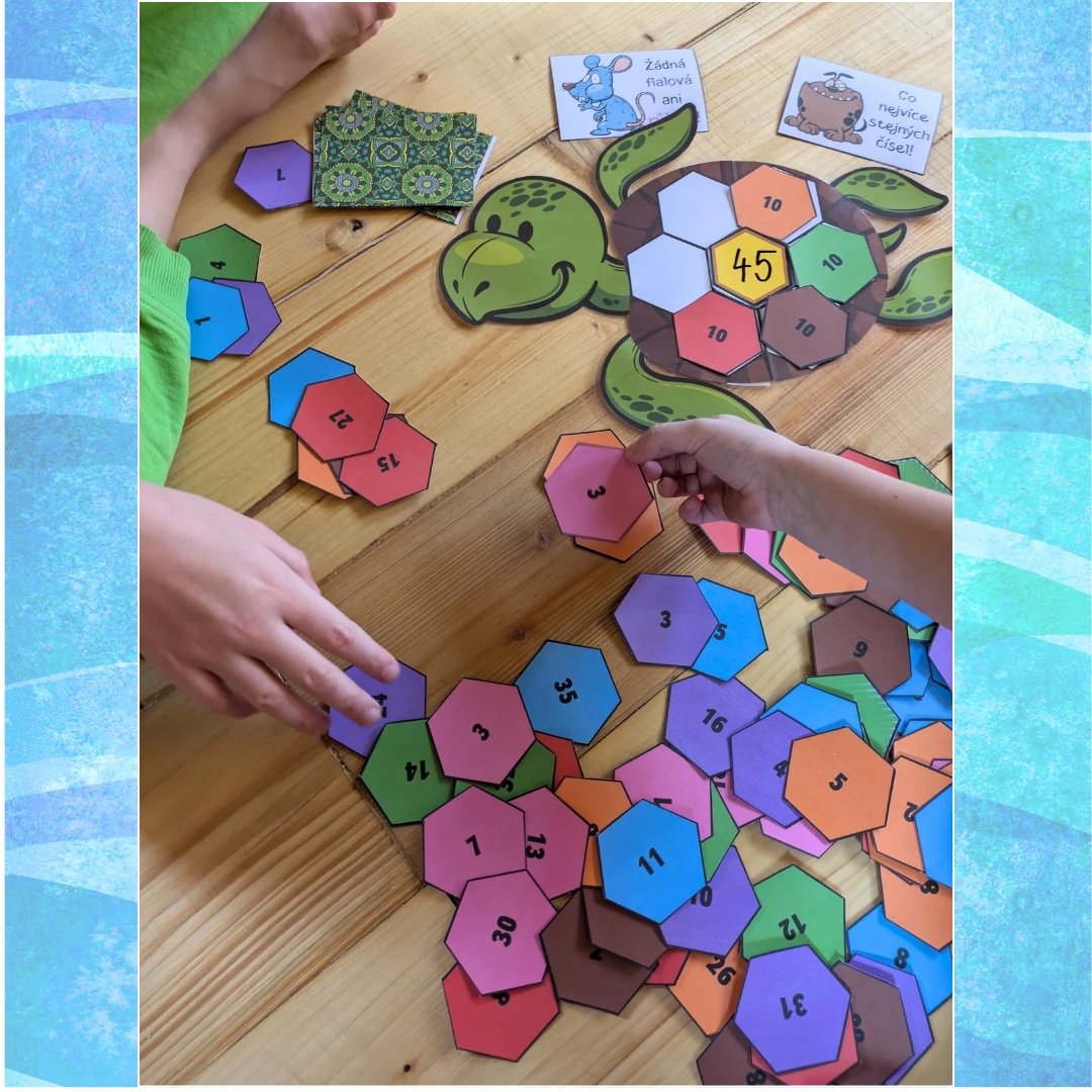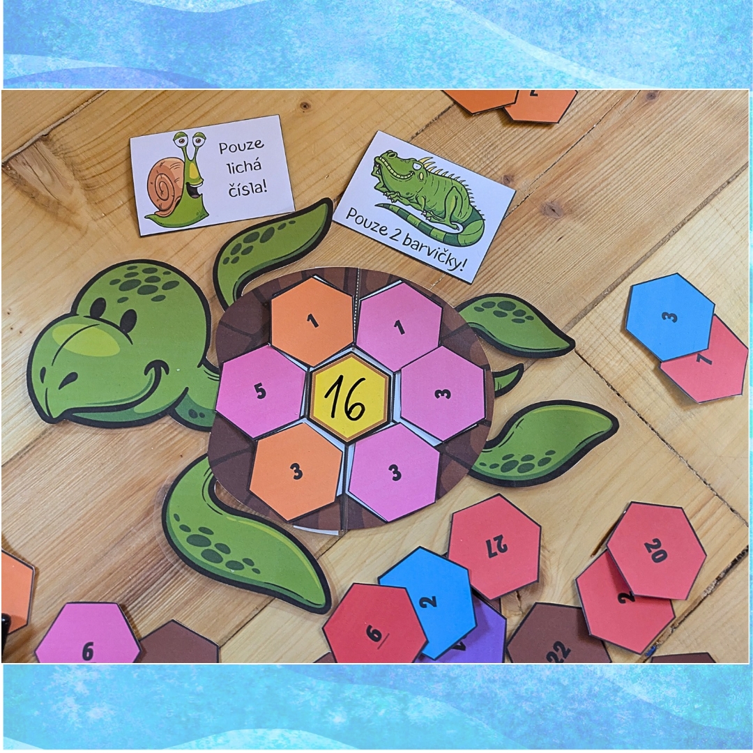 Děti skládají kartičky na bílá políčka na krunýři velké želvy 🐢 a při tom si upevňují dovednost sčítání (příp. i další matematické operace), rozvíjí logické myšlení a kombinatoriku.