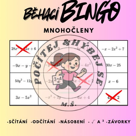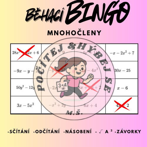 Aktivní forma procvičení mnohočlenů, která kombinuje výpočty, pohyb a prvek hry. Žáci řeší příklady rozmístěné po třídě a zapisují správná řešení do bingo tabulky (4x4). Cílem je propojit čtyři správné výsledky a získat BINGO.