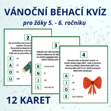 Kvíz je určen pro žáky 6. ročníku (lze využít i v 5. či 7. ročníku). Obsahuje vánoční úlohy v rozsahu učiva 1. stupně (včetně dělení dvouciferným číslem). Učivo 6. ročníku zde není zařazeno kvůli rozdílným osnovám v prvních měsících školního roku (vyskytuje se zde ale např. výsledek pomocí desetinného čísla 4,5).