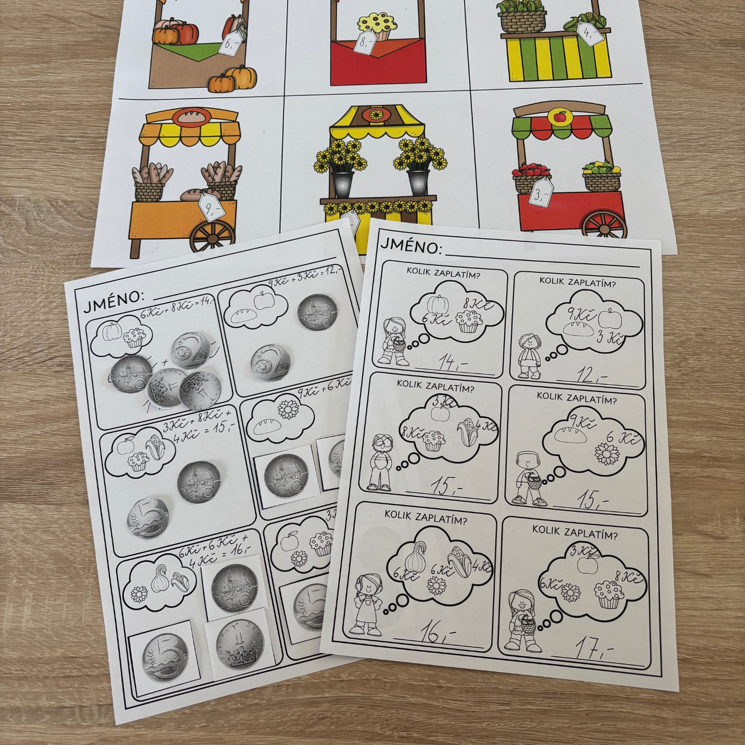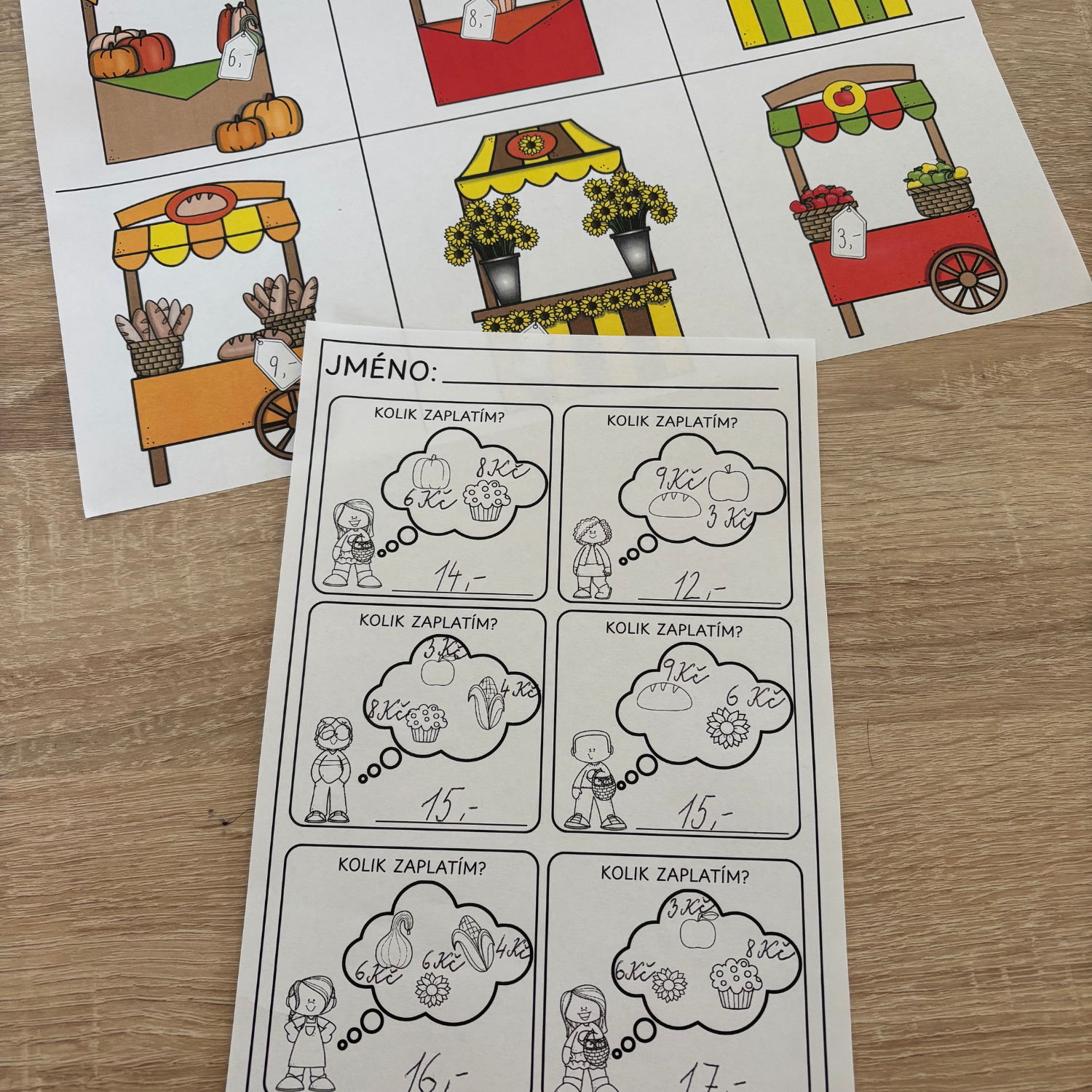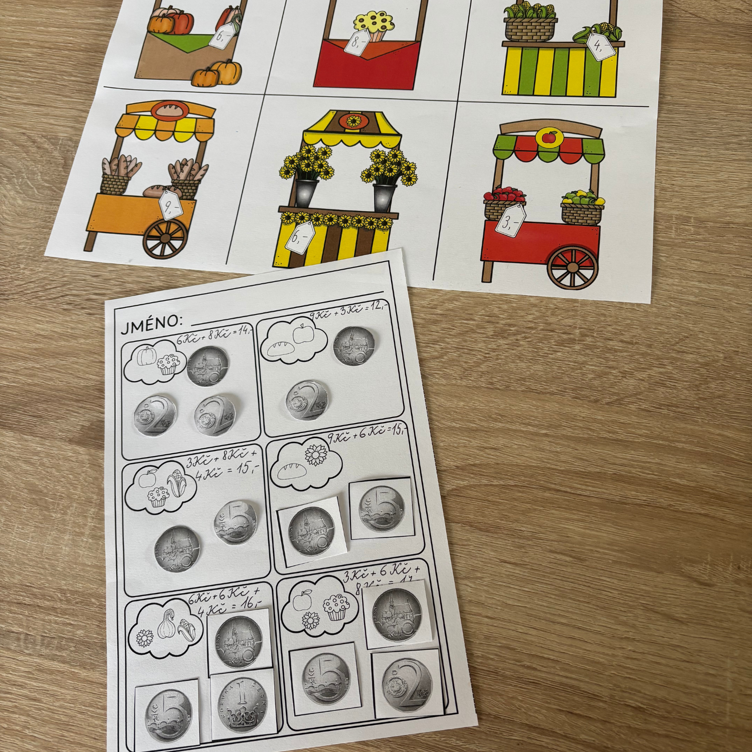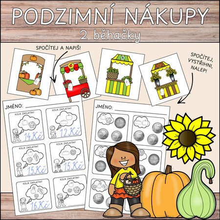 Materiál obsahuje dvě verze aktivity s názvem Běhací nákupy – Počítej a napiš a Počítej a nalep. V první variantě žáci zapisují cenu nákupu číslem, ve druhé tuto hodnotu vyjadřují pomocí papírových mincí, které vystřihnou a nalepí.