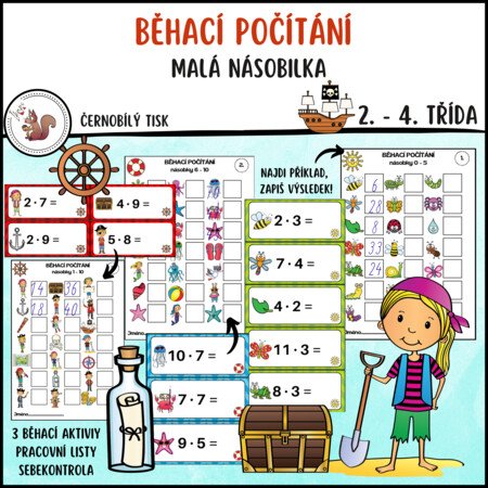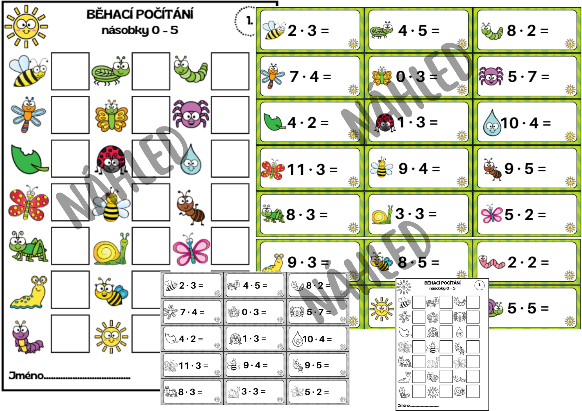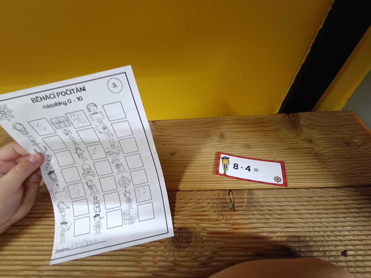 Kartičky s příklady rozmístěte po třídě, chodbě, venku, kdekoliv :o). Žáci obdrží 1x A5 kartu k dopisování výsledků.