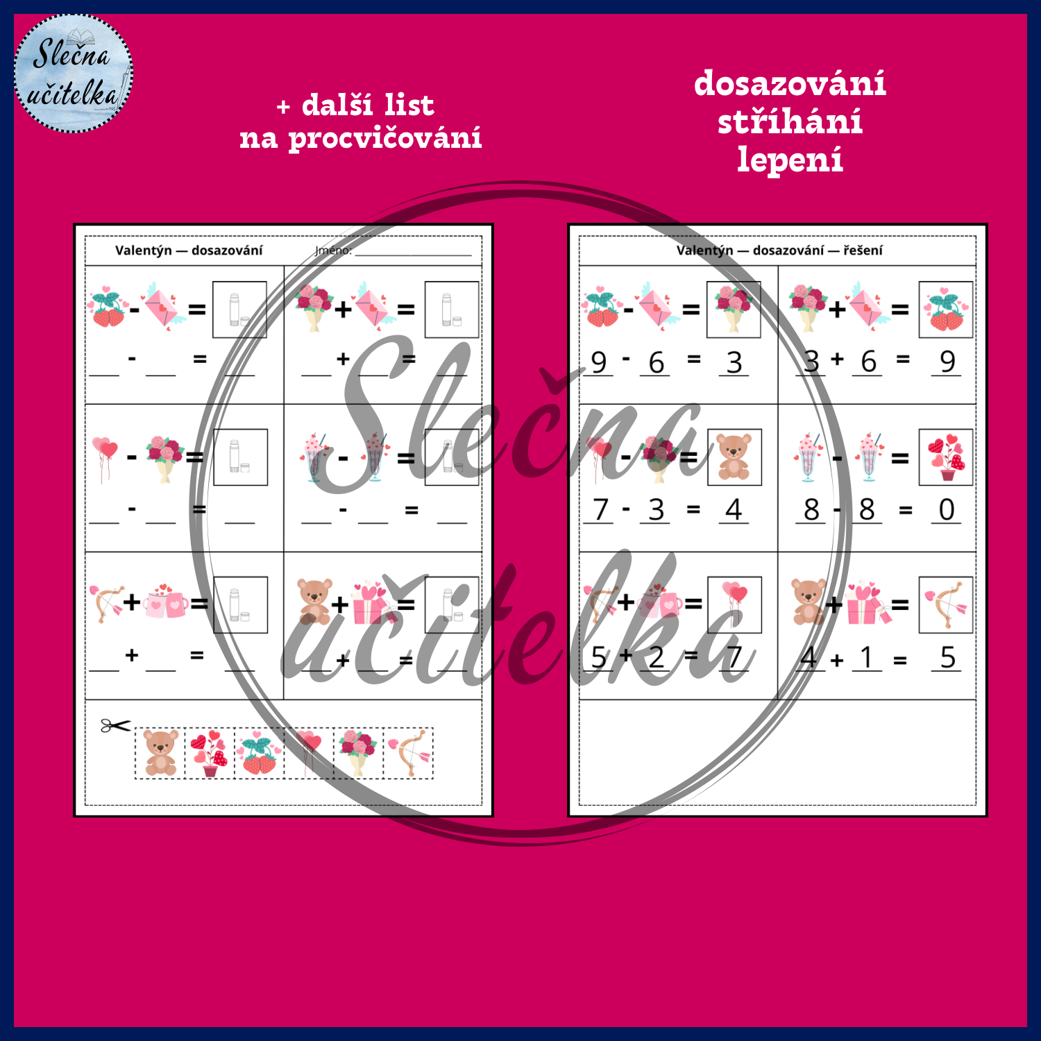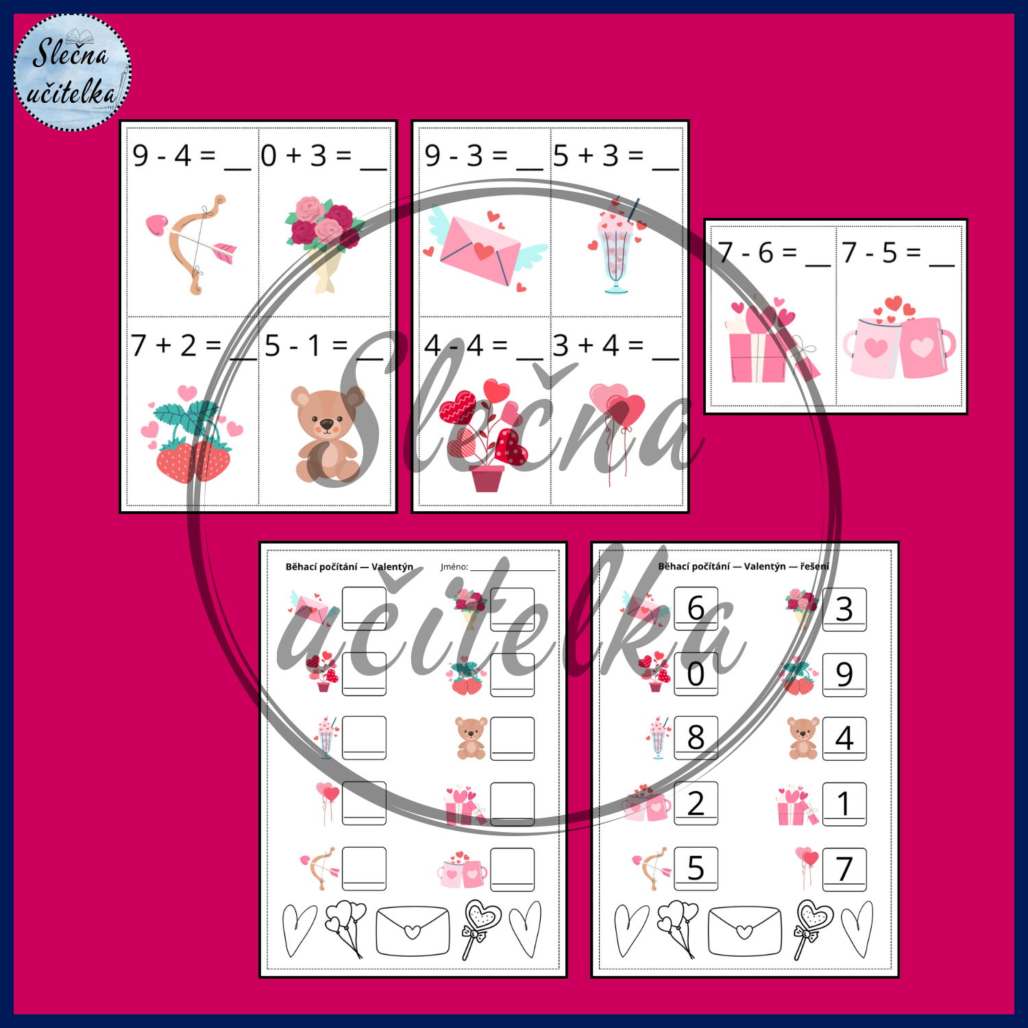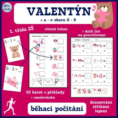 - list na procvičování + a -, dosazování, stříhání, lepení: lze spočítat pouze na základě výsledků z běhací aktivity - žáci dosadí čísla za obrázky, spočítají příklad, dle výsledku přiřadí správný obrázek, který vystřihnou a nalepí na vyznačené místo.