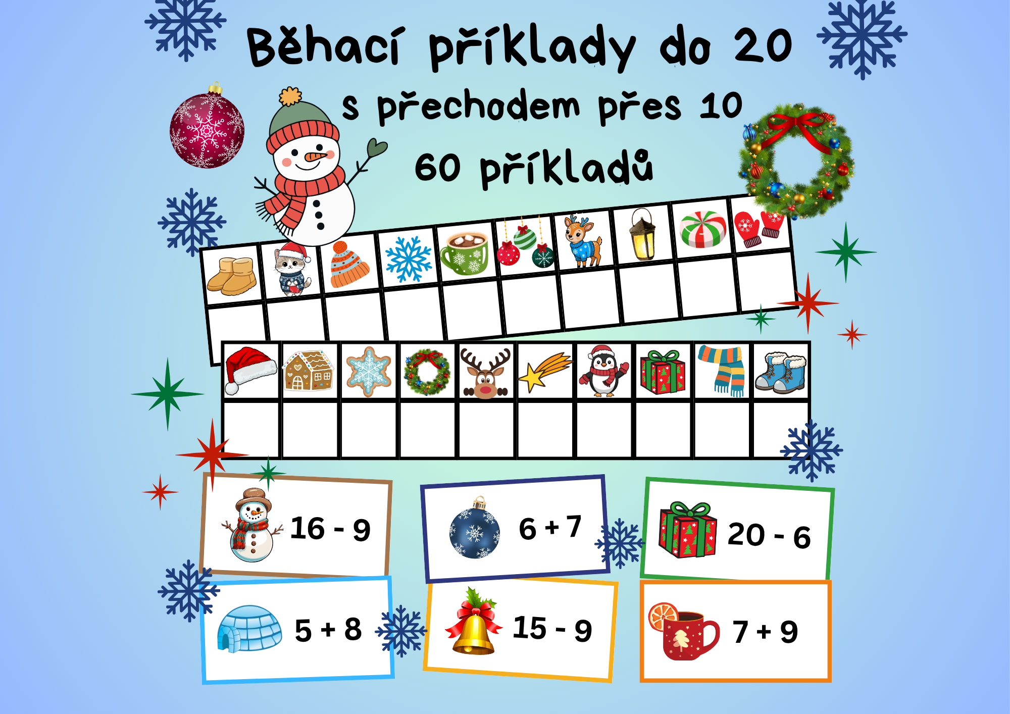 ❄️Soubor obsahuje 60 různých kartiček s příklady.
