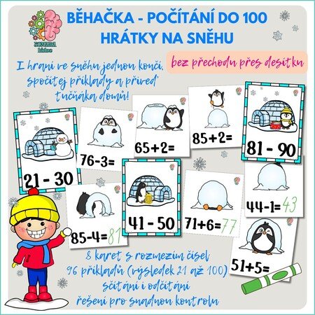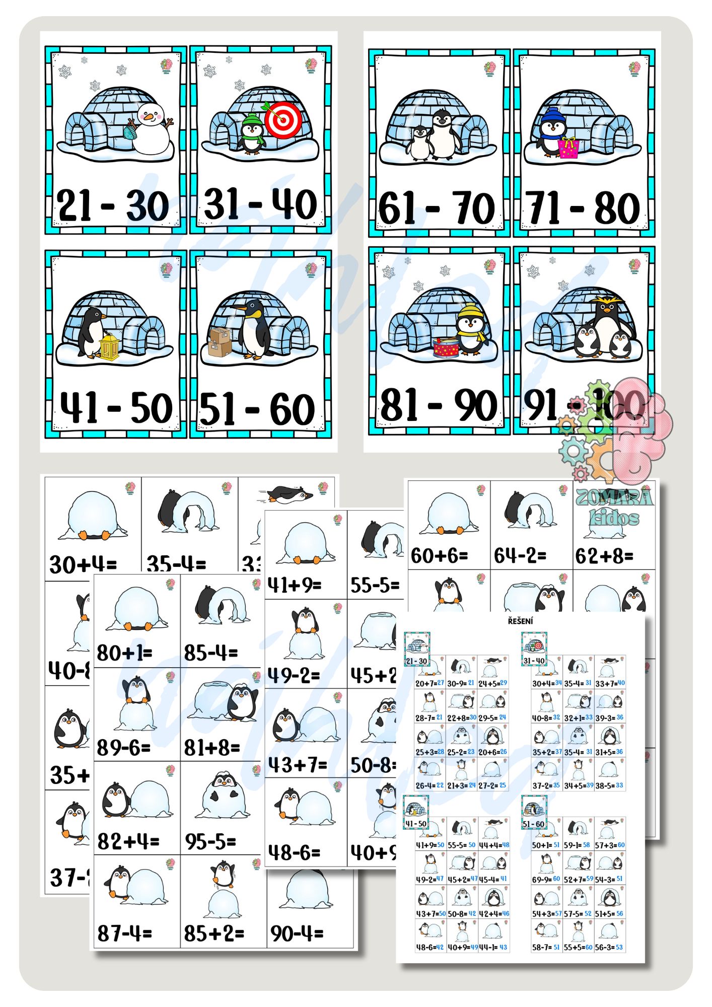 - 96 početních příkladů na sčítání a odčítání do 100 bez přechodu přes desítku v podobě kartiček s motivem tučňáků.