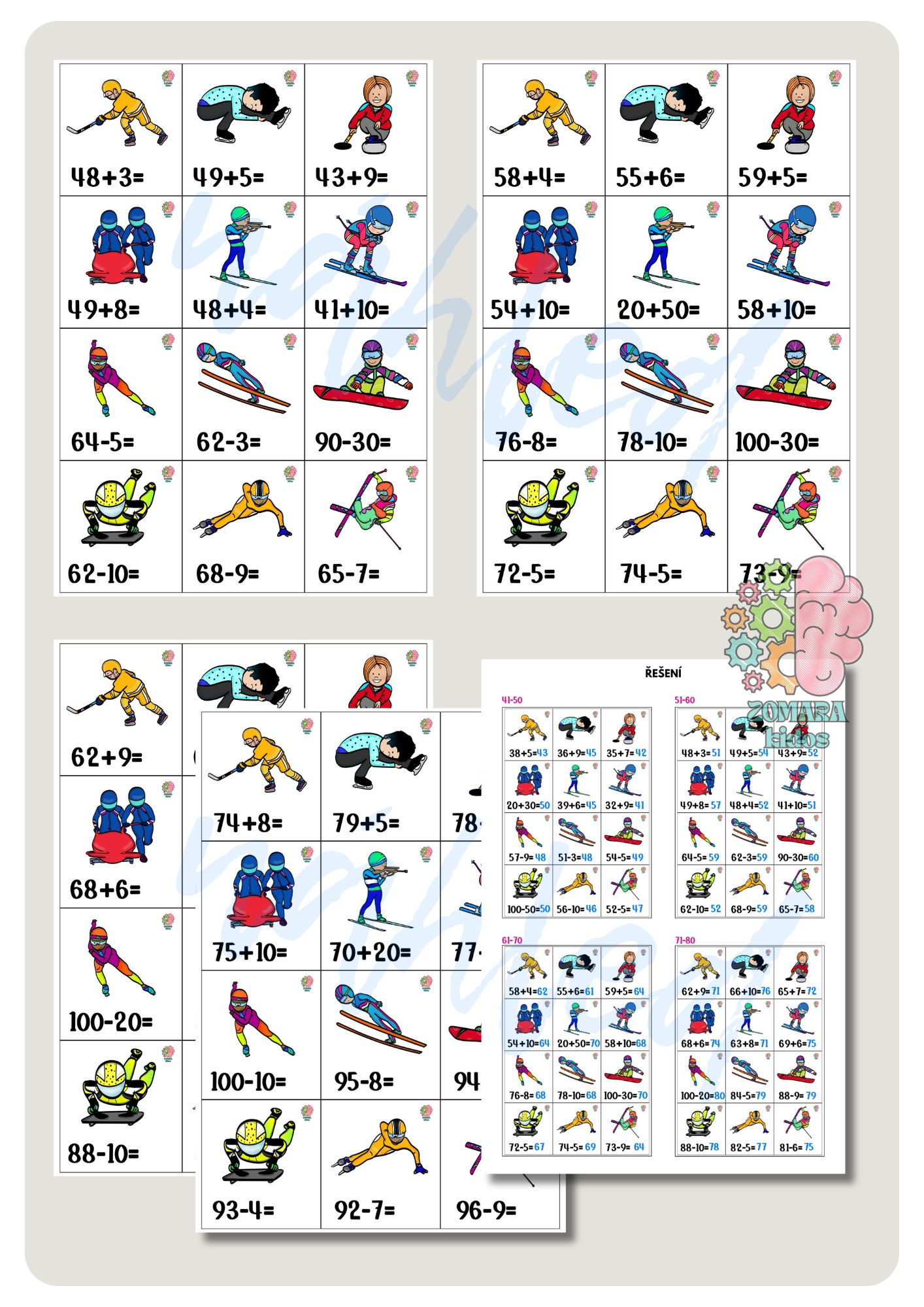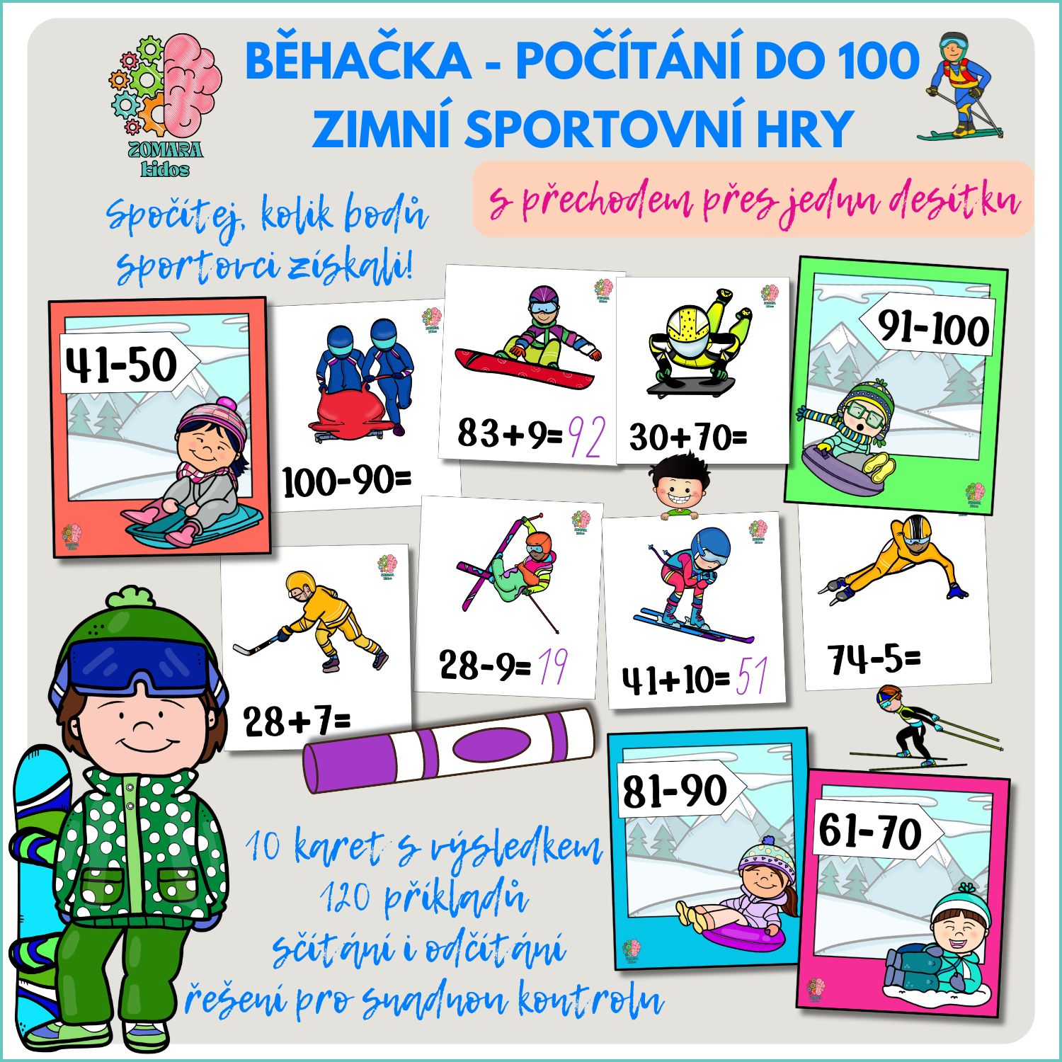 Zimní sportovní hry vrcholí a každý výkon přináší body! Děti počítají, kolik bodů sportovci získali, a běhají s kartičkami ke správným číselným rozmezím. 120 příkladů na sčítání a odčítání do 100 s přechodem přes jednu desítku a také počítání s celými desítkami. Ideální k laminaci.