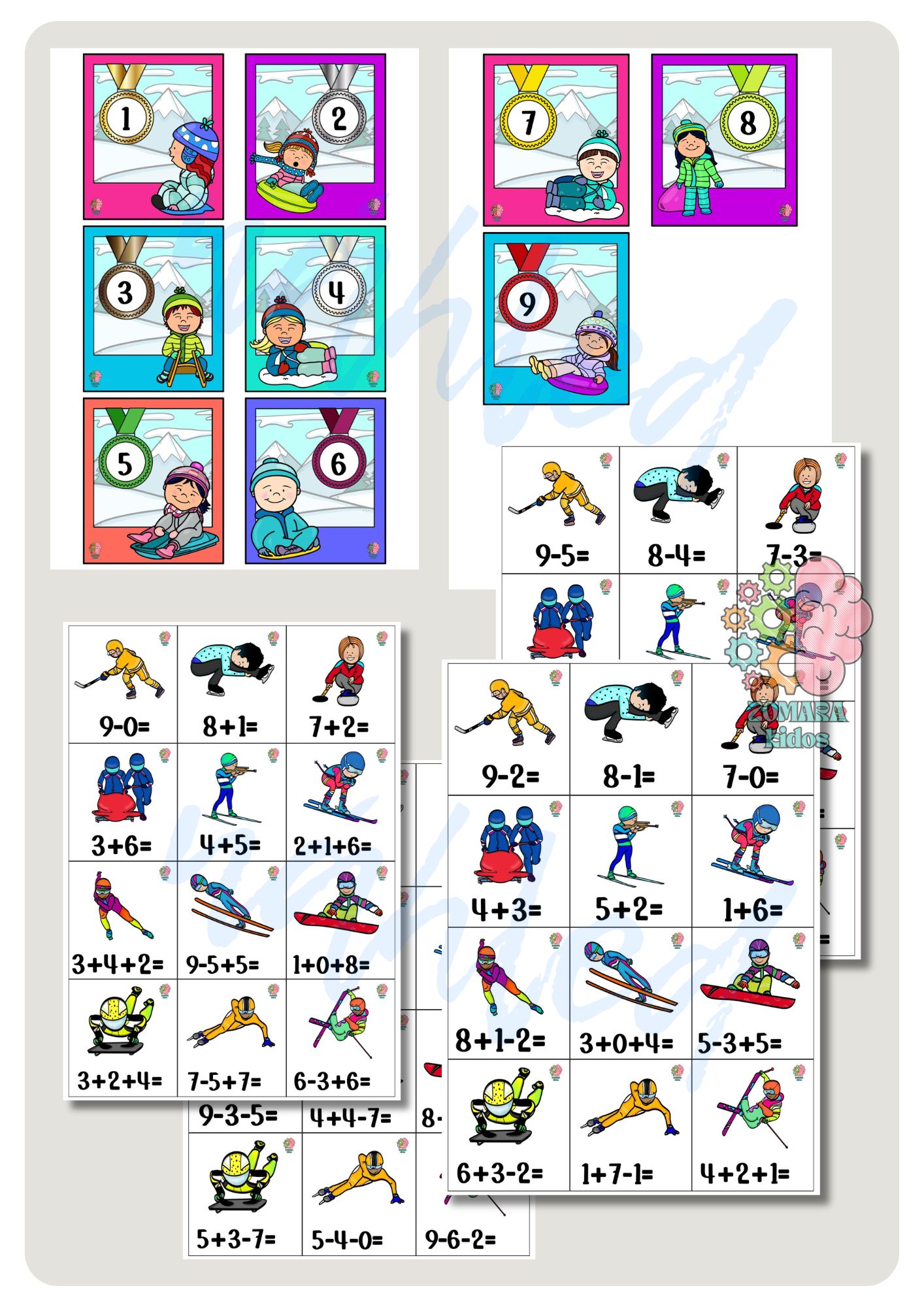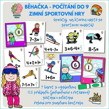 Zimní sportovní hry ve třídě ve formě běhačky na procvičení počítání do 9. Děti čeká celkem 108 jednoduchých i řetězových příkladů na sčítání a odčítání, podle kterých určují pořadí sportovců v cíli. Řešení formou jasné vizuální kontroly.