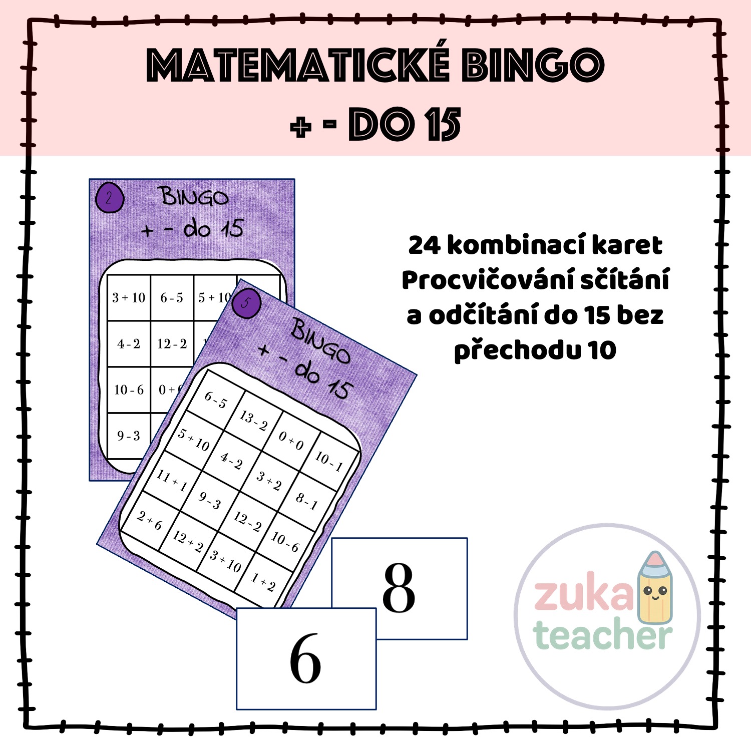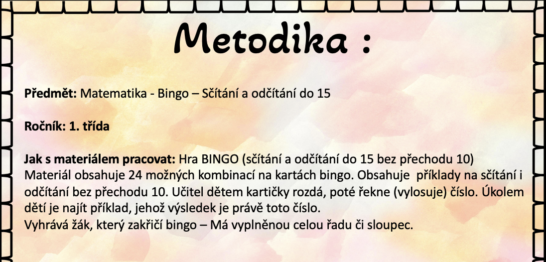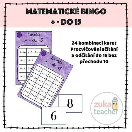 Materiál obsahuje 24 možných kombinací na kartách bingo. Obsahuje příklady na sčítání i odčítání bez přechodu 10. Učitel dětem kartičky rozdá, poté řekne (vylosuje) číslo. Úkolem dětí je najít příklad, jehož výsledek je právě toto číslo.