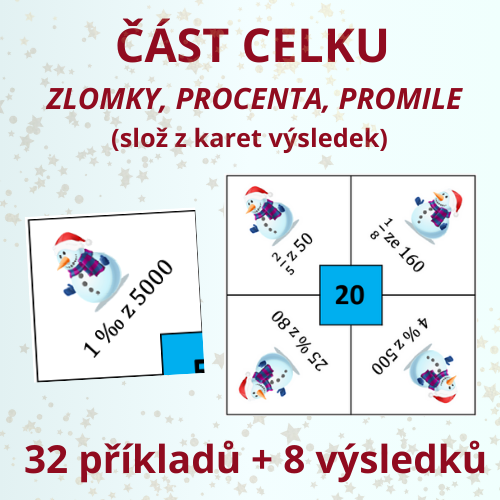 Popis aktivity: Aktivita obsahuje 8 čtveřic karet. Vždy k sobě patří 4 karty se stejným výsledkem. Každá čtveřice obsahuje 2 příklady se zlomky a 2 příklady s procenty (případě s promile).