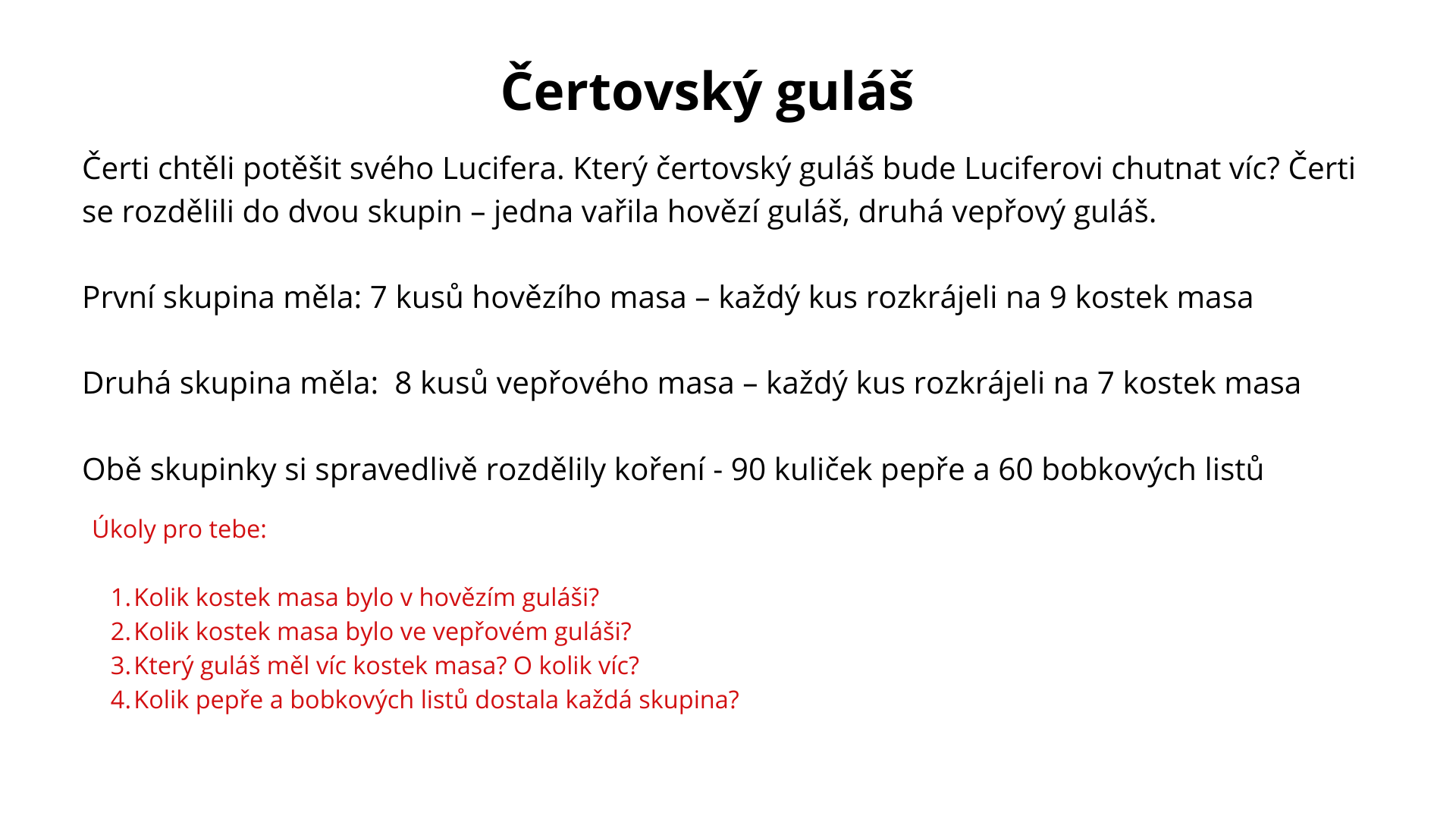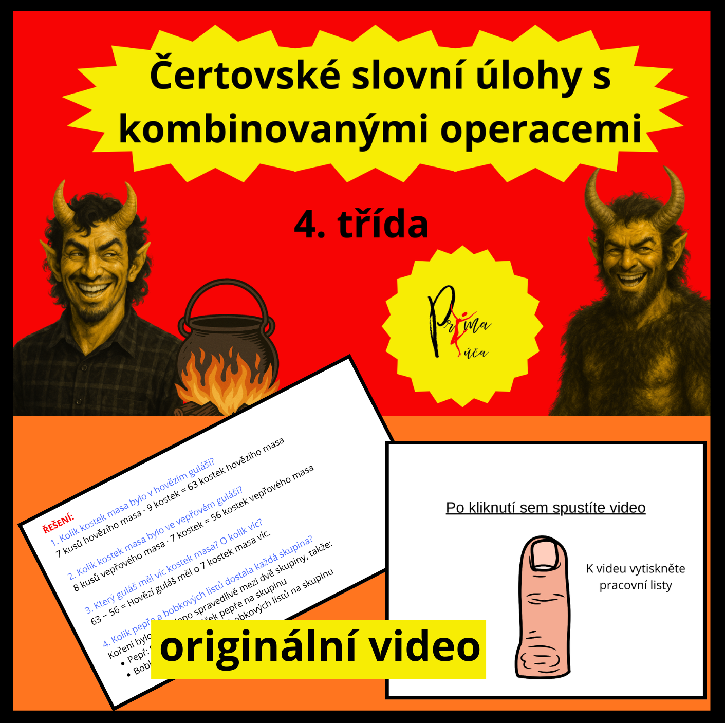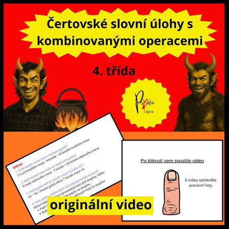 Materiál obsahuje pět slovních úloh + řešení, které dětem představím nejprve formou videa. Video slouží k postupnému promítání zadání úloh s animacei a čertovskými zvuky. Děti pak do pracovních listů zpracovávají samostatně nebo ve dvojici tuto úlohu.