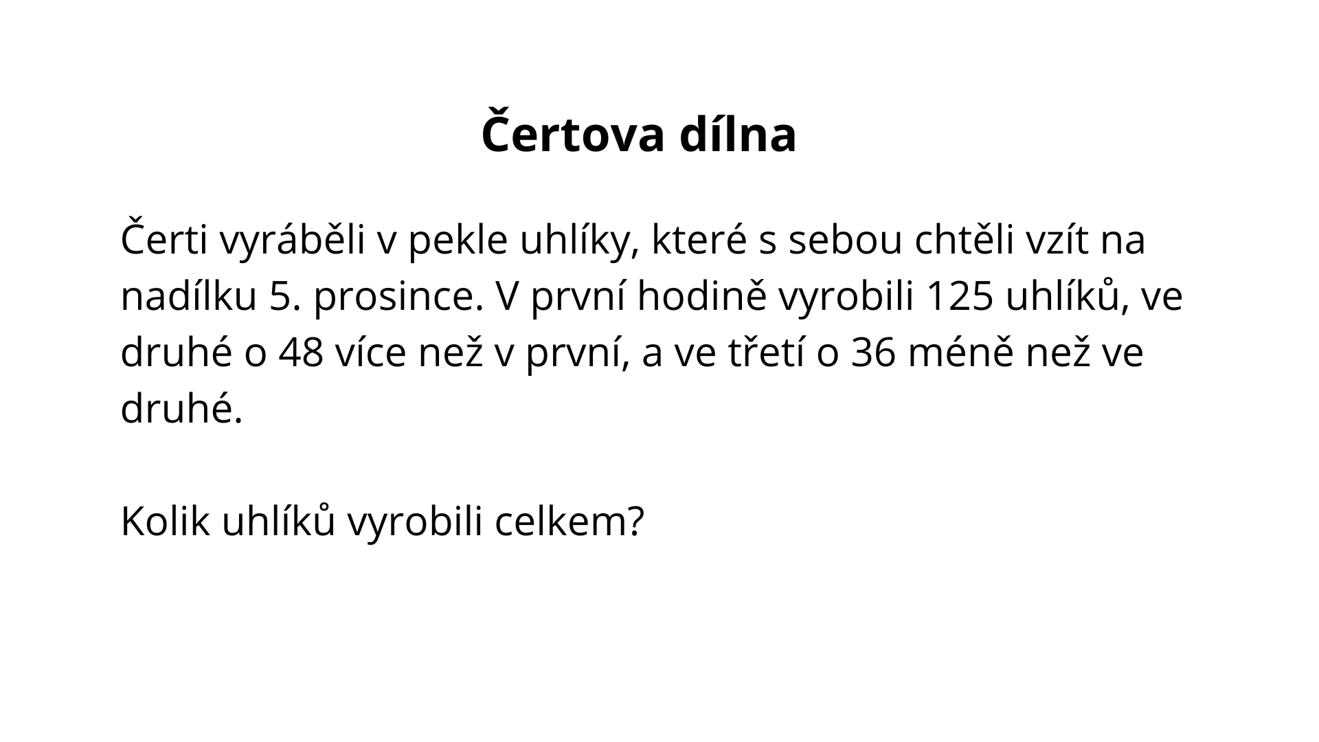 - Čertova dílna (kombinace sčítání a odečítání s příběhem o výrobě uhlíků),