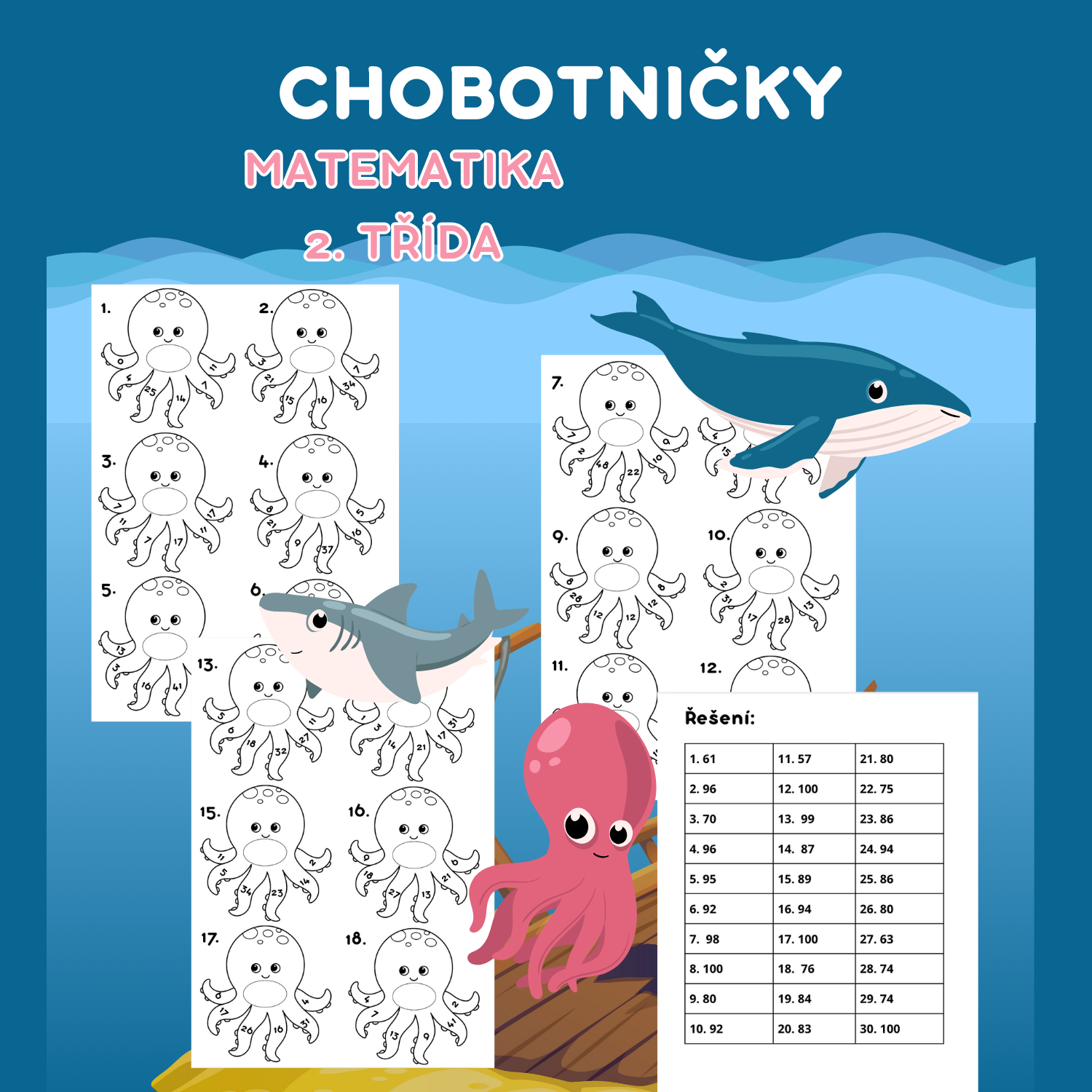 Návod na přípravu: Při přípravě materiálu je potřeba vytisknout všechny chobotničky a řešení hry. Následně chobotničky můžete rozstříhat nebo je necháte jako pracovní listy. Pro delší životnost materiálu doporučuji rovněž zalaminování kartiček/pracovních listů. Pokud budete mít chobotničky zalaminované, mohou žáci výsledky psát na folii fixou a můžete materiál používat stále dokola.