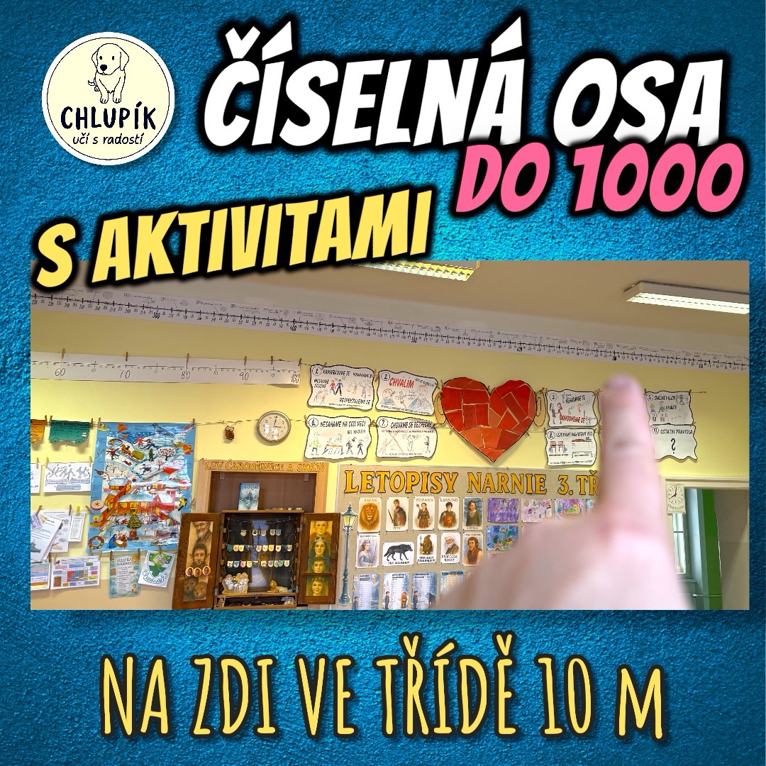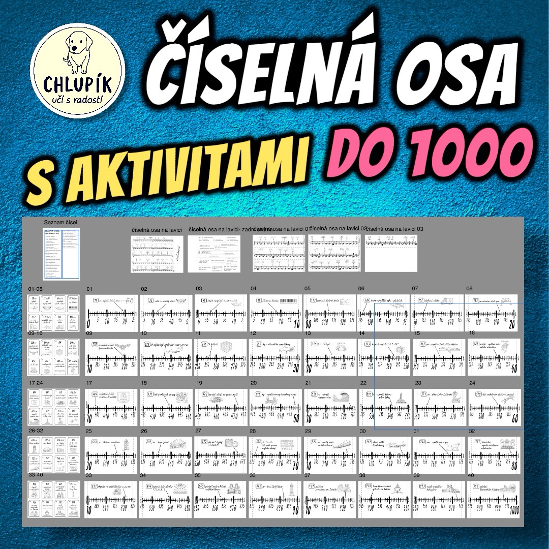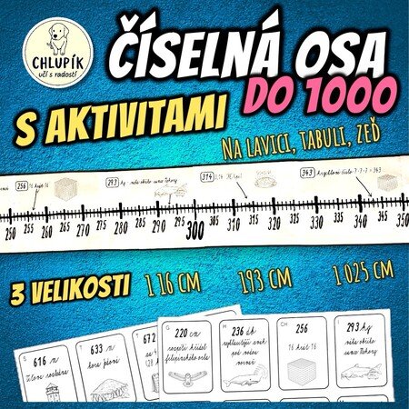 Tři číselné osy s aktivitami do 1000 v různých velikostech pro třídu i doma. Na zeď, tabuli i lavici. 40 zajímavých čísel s obrázky (nejen z Guinnessovy knihy rekordů) a abecední kartičky pro hravou orientaci na ose.