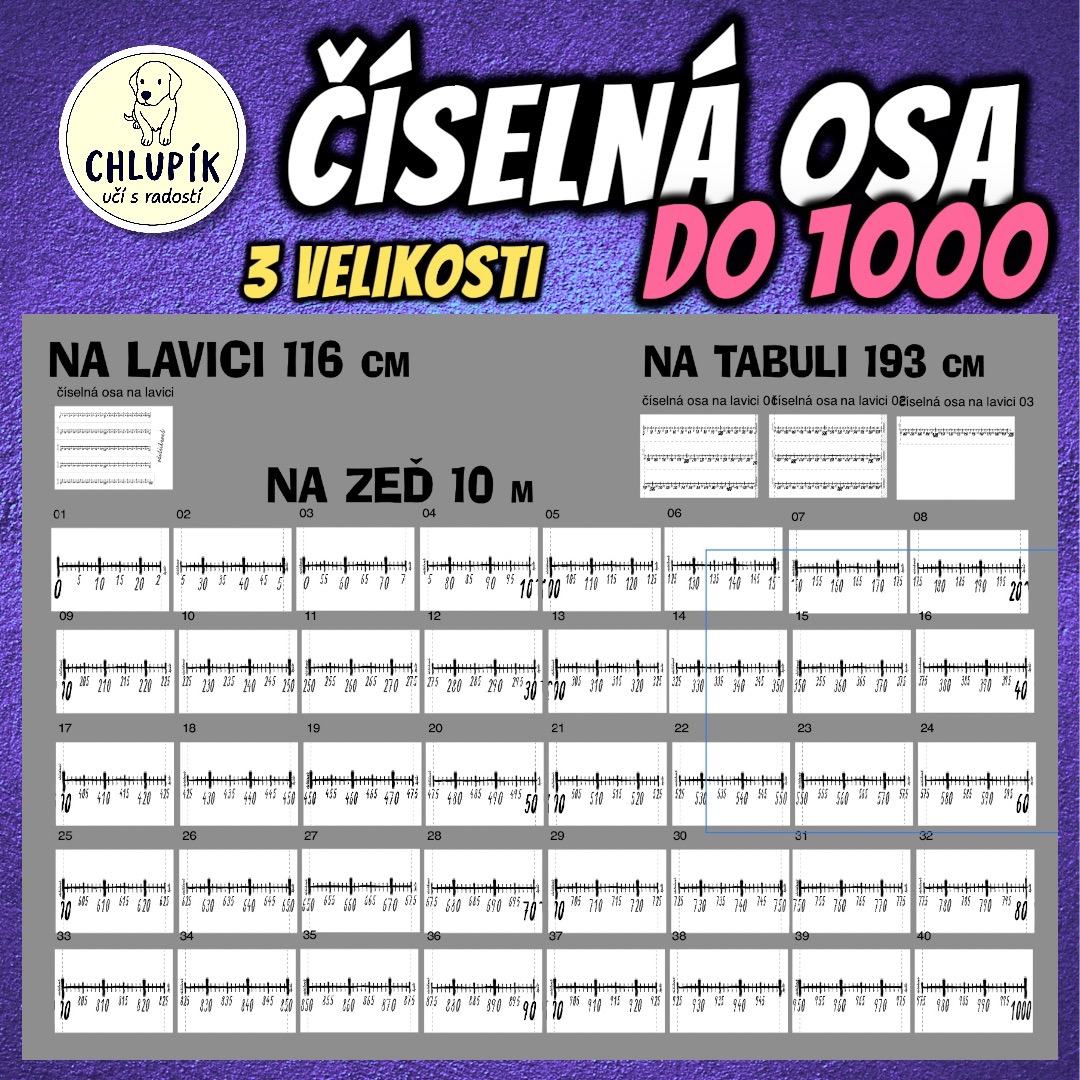 Tři praktické číselné osy do 1000 v různých velikostech, ideální pro práci ve třídě i doma. Hodí se na zeď, tabuli nebo lavici a díky ručně psanému stylu působí přirozeně a dětem blízkým dojmem.