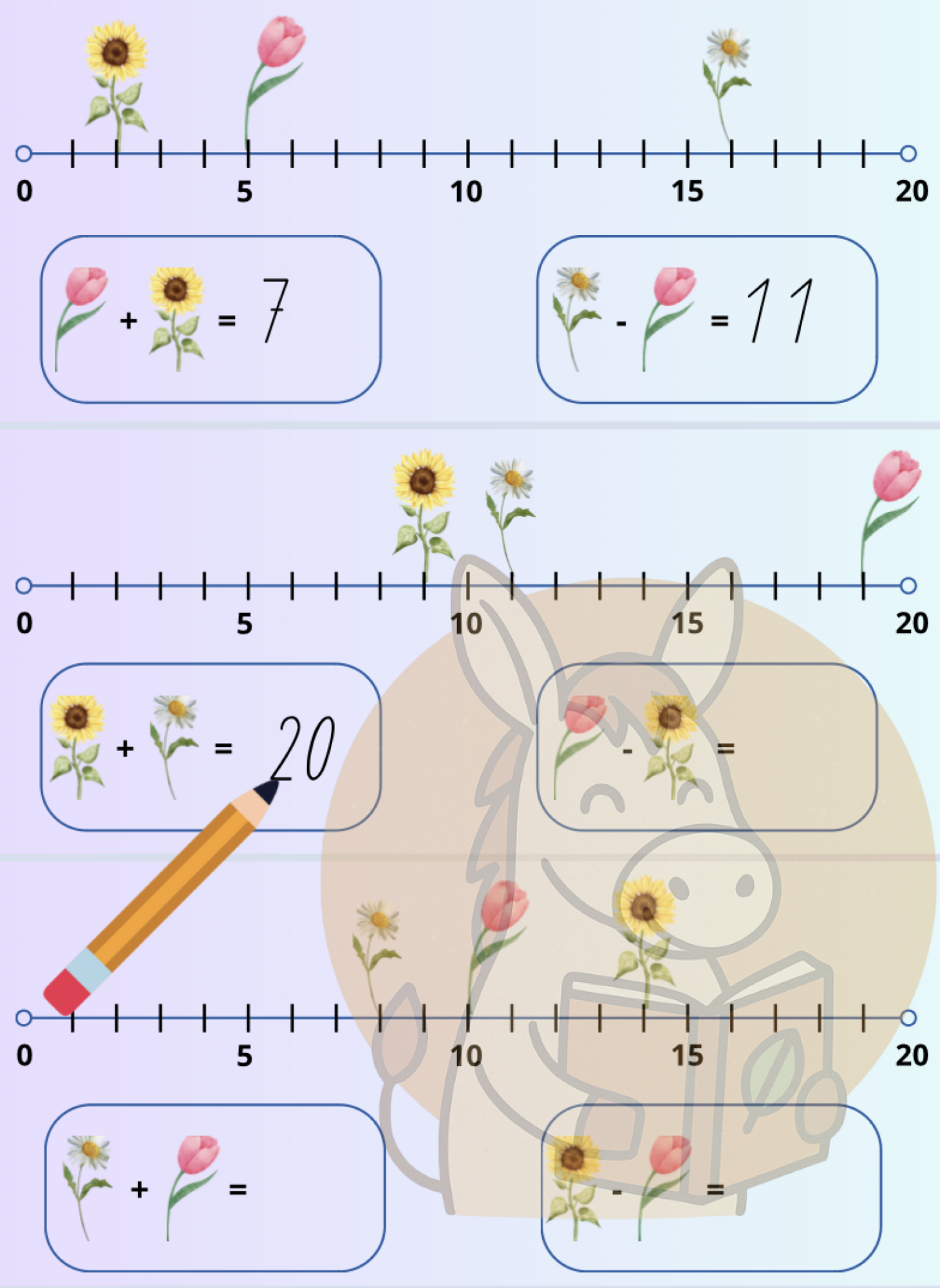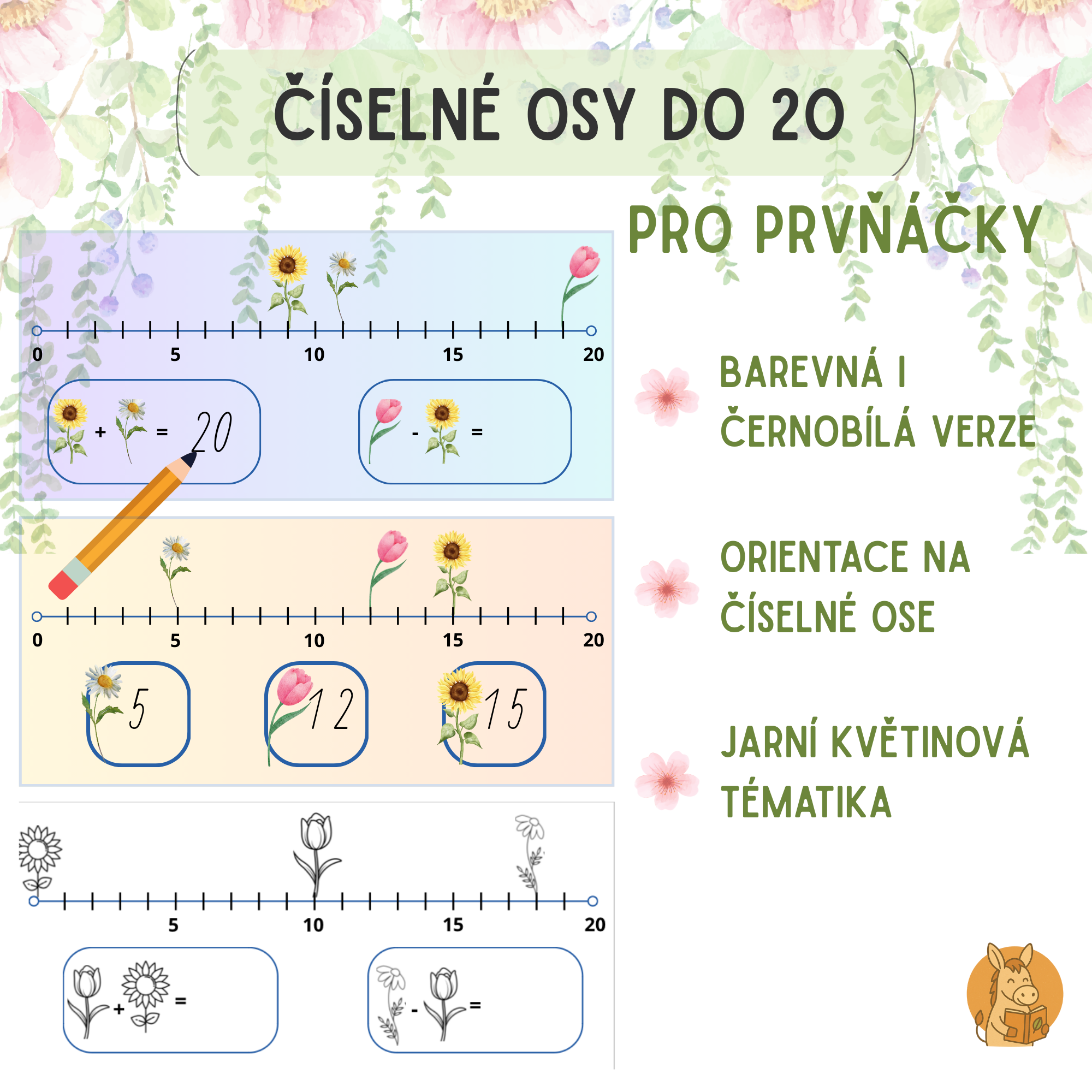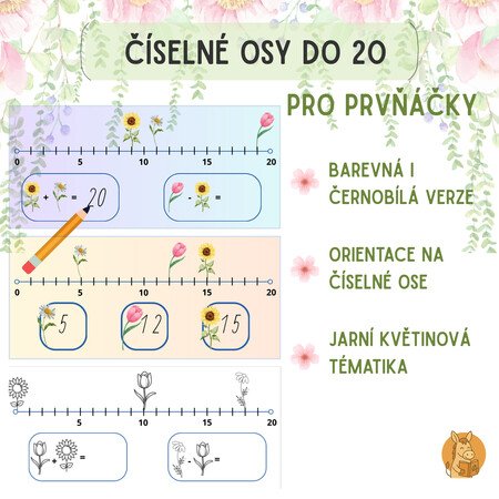 Tento materiál pomáhá žákům zlepšit orientaci na číselné ose a procvičit sčítání a odčítání do 20 bez přechodu přes základ deset. Součástí jsou i gradované číselné osy pro tvorbu a výpočet příkladů. Materiál je k dispozici v barevné i černobílé verzi pro tisk a může být využit jak pro vyvození orientace na číselné ose, tak jako bonusový úkol pro rychlíky nebo jako zpestření výuky matematiky.