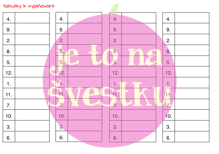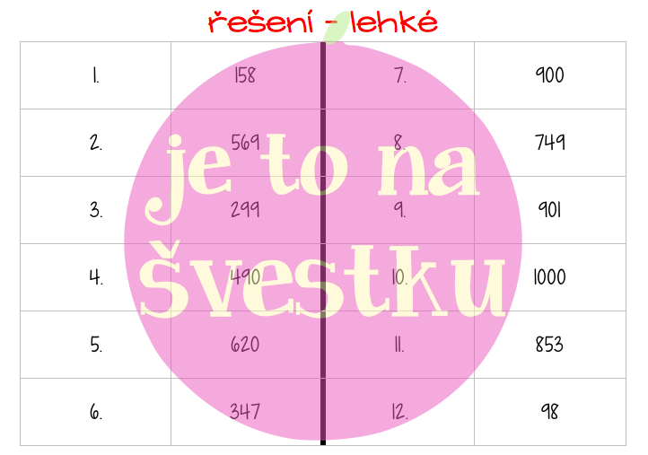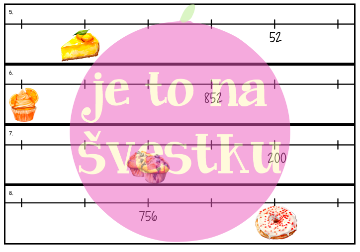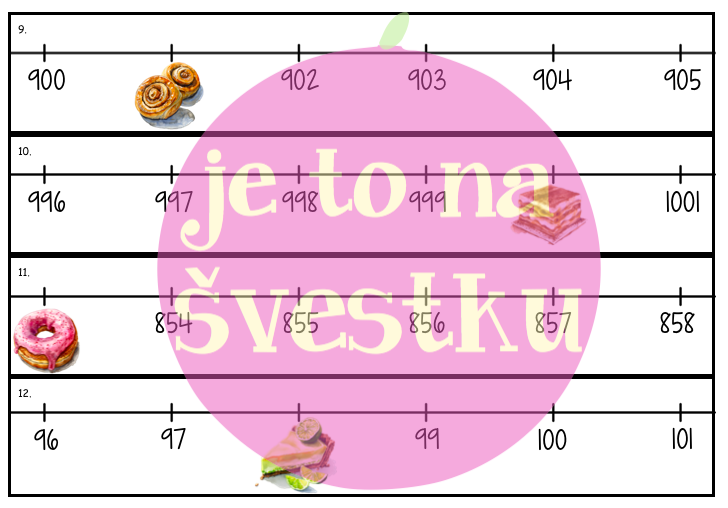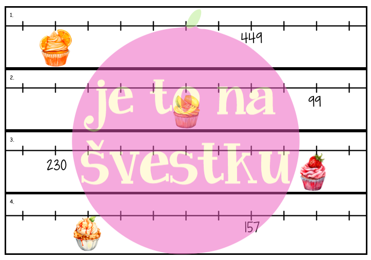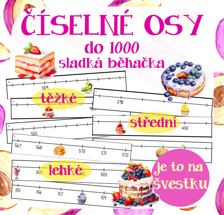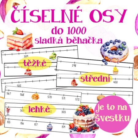 Materiál obsahuje číslené osy, kde vždy jedno číslo zakrývá nějaká dobrota. Najdete zde tři obtížnosti - těžkou - střední - lehkou. V každé obtížnosti jsou vždy jiná čísla, takže je zde celkem 36 různých číselných os. Číselné osy rozmístíte po třídě a žáci chodí a zapisují čísla do tabulky a nebo do sešitu. Osy také můžete rozdat žákům k vyplnění chybějících čísel.