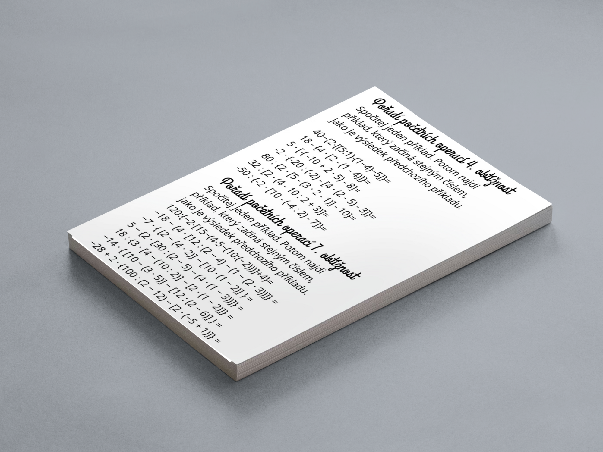 - Rozložení s prostorem pro řešení – za každým příkladem je ponechán vyhrazený prostor určený pro zapsání postupu a výsledku.