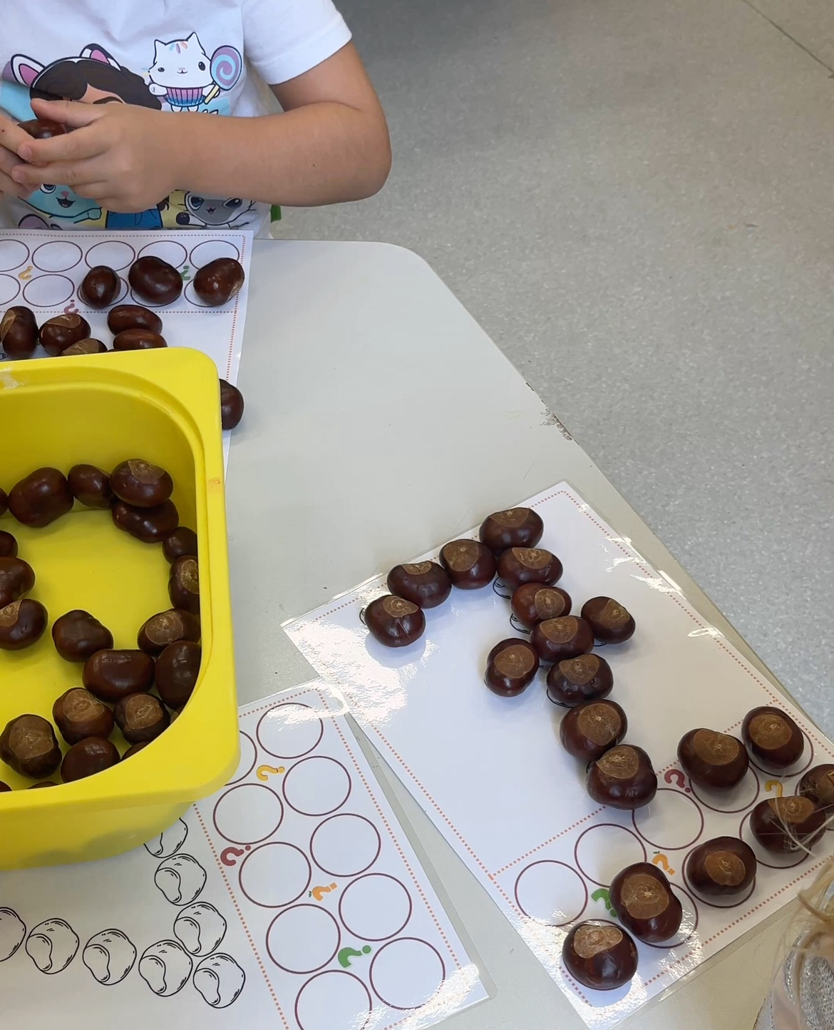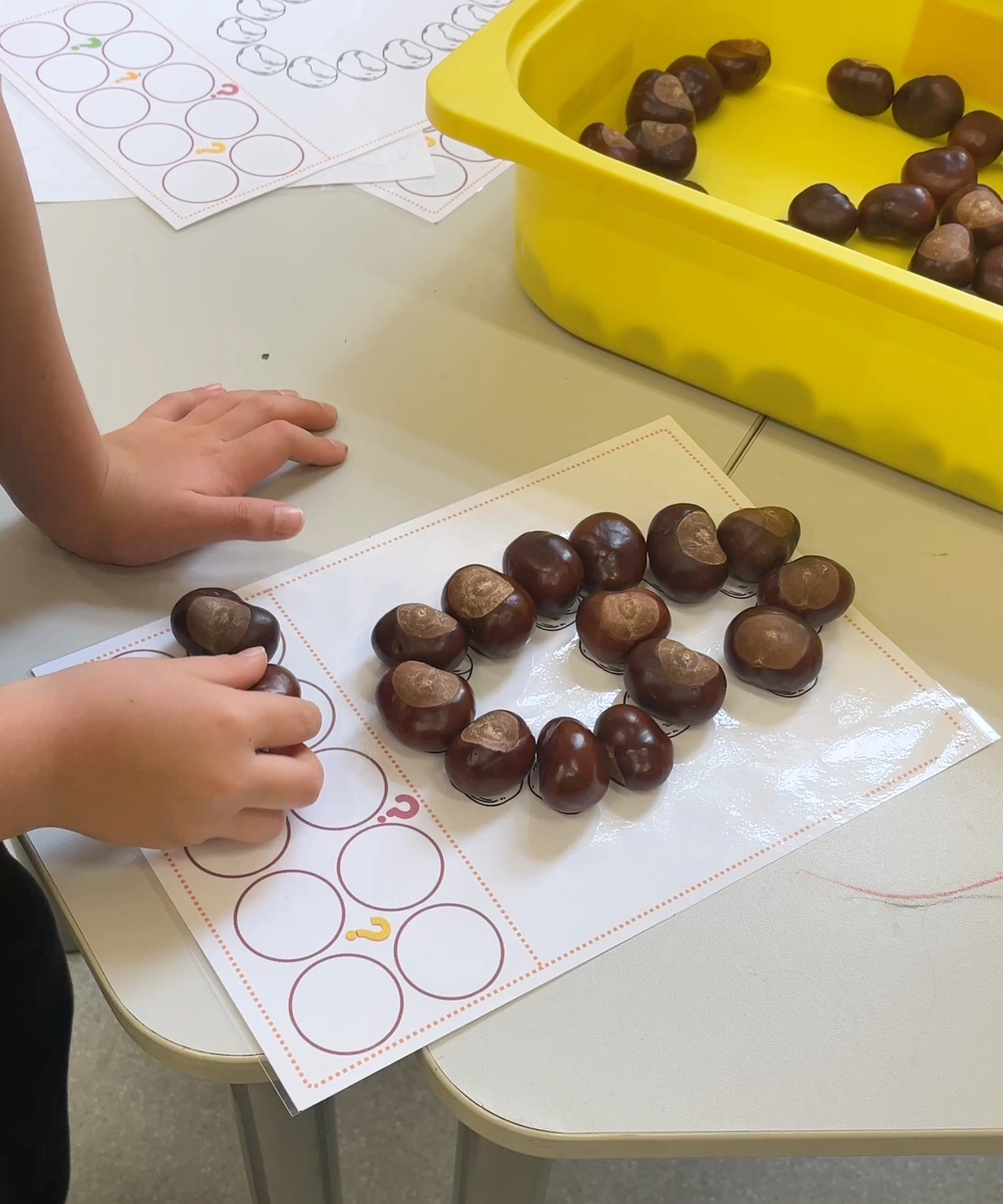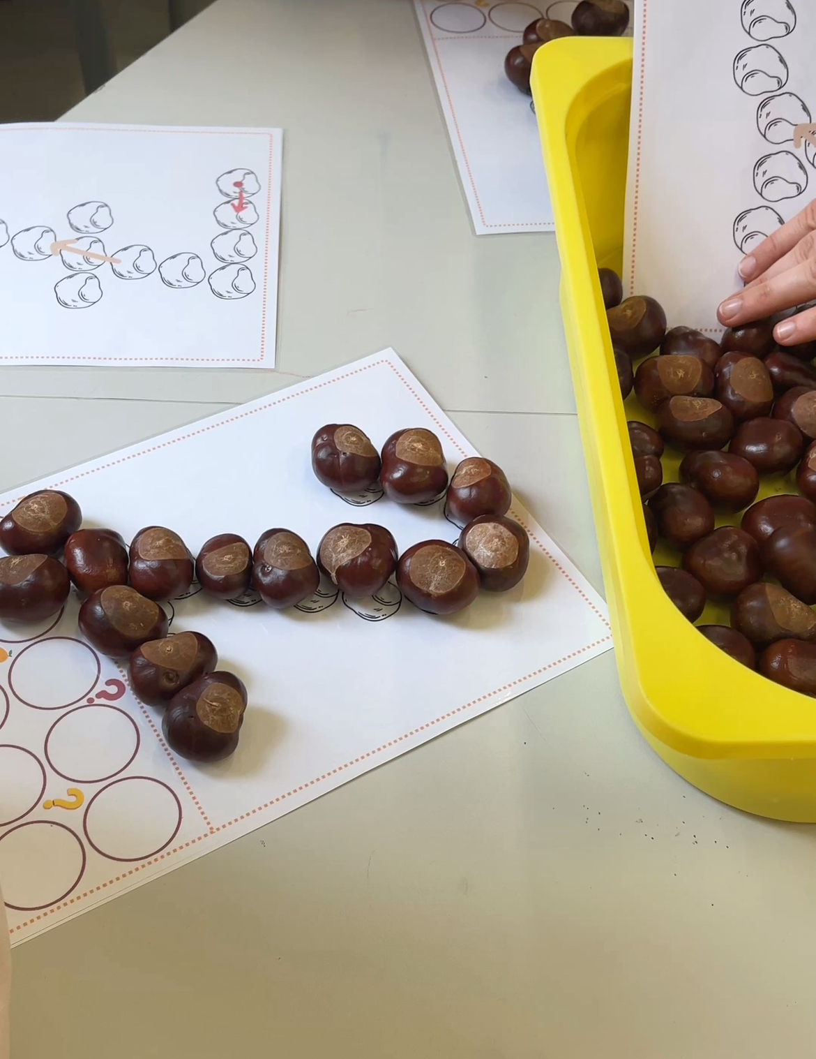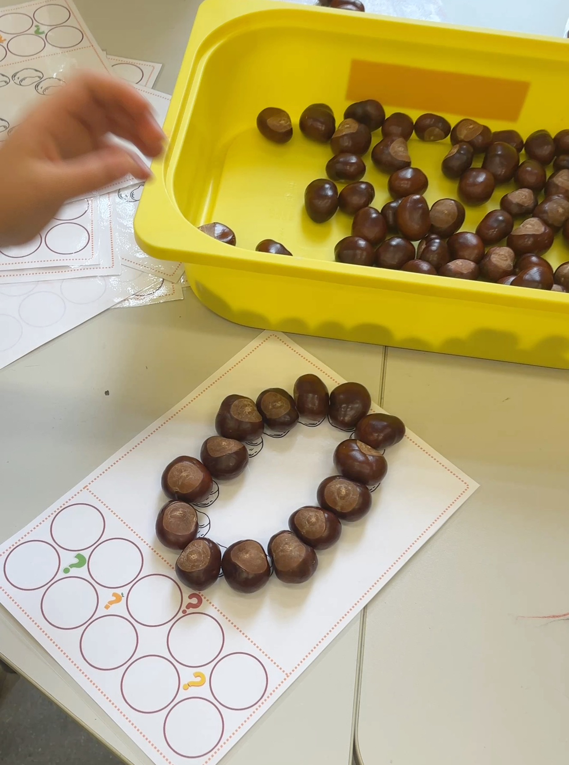 Hravá aktivita pro prvňáčky - skládání číslovek z kaštanů a přiřazování počtu k číslovce. Manipulace s přírodninami, ideální před vyvozením číslovek a při upevňování vztahu číslovka = počet.