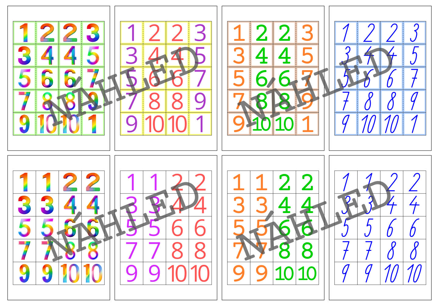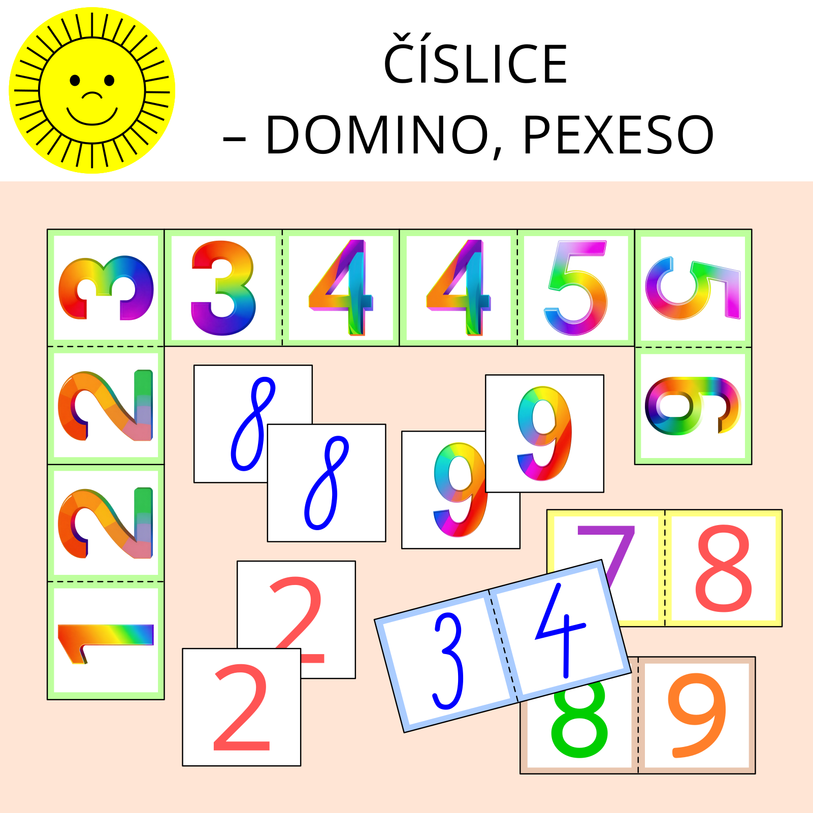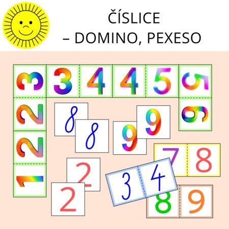 Materiál na poznávání podoby číslic od 1 do 10 obsahuje 4 strany s kartičkami domina (1 strana = 1 sada kartiček domina) a 4 strany s kartičkami pexesa (40 dvojic).
