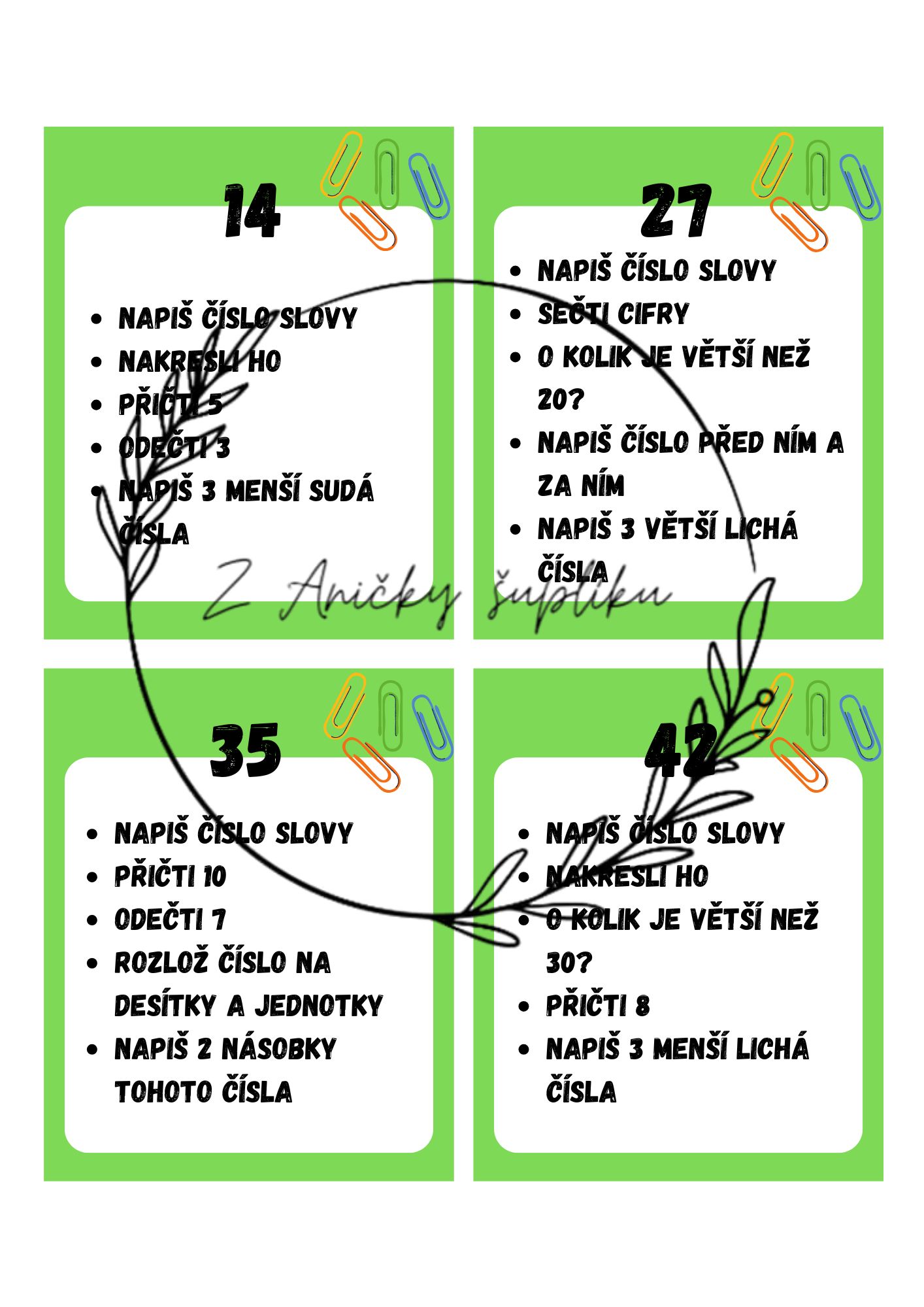 Číslo dne – sada 24 karet, které dětem pomáhají procvičit čísla zábavnou formou. Na každé kartě je jedno číslo a pět různých úkolů. Karty jsou rozděleny do tří úrovní podle barev – zelená, žlutá a červená – takže si každý může vybrat obtížnost podle svých možností. Materiál podporuje logické myšlení, soustředění i práci s čísly v různých souvislostech.