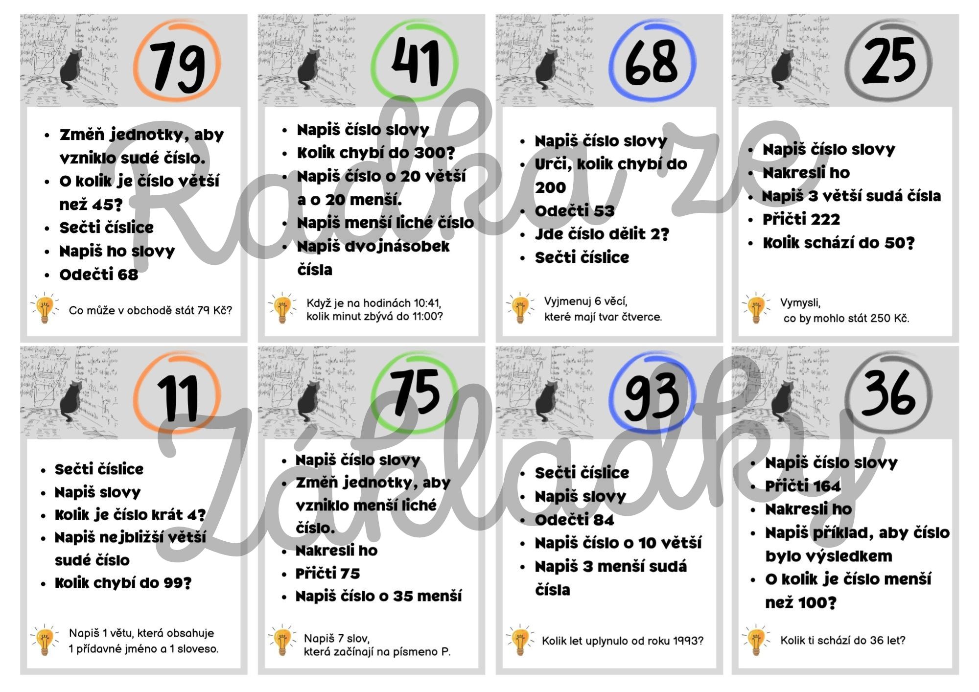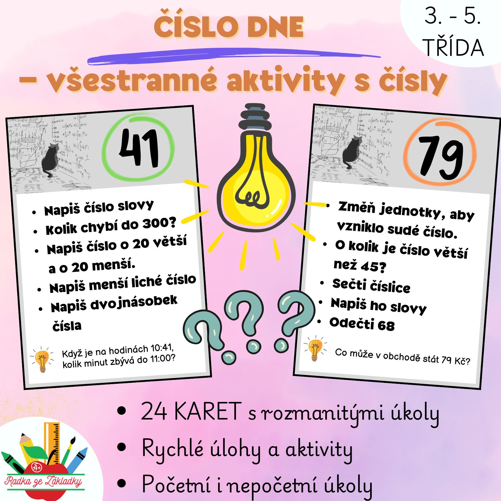 Soubor „Číslo dne – všestranné aktivity s čísly“ nabízí rozmanité a lehce diferencovatelné úkoly pro žáky 3.–5. ročníku. Každá kartička pracuje s jedním konkrétním číslem a vede žáky k porovnávání, výpočtům, práci s číslicemi, odhadům i k jednoduchým aplikačním úkolům z běžného života.