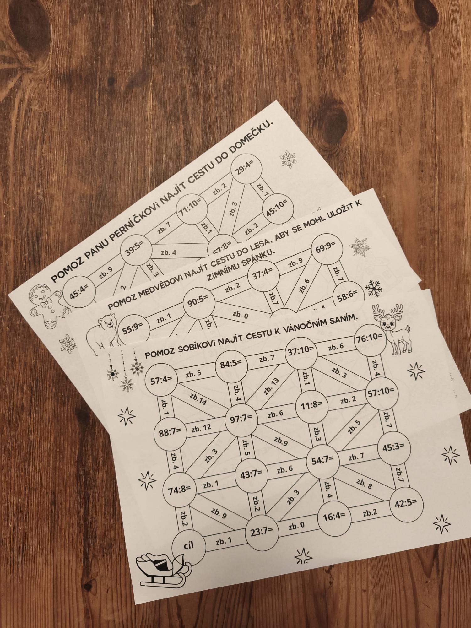 Každý správný výsledek určí, kam žák může pokračovat dál – směrem s odpovídajícím zbytkem.