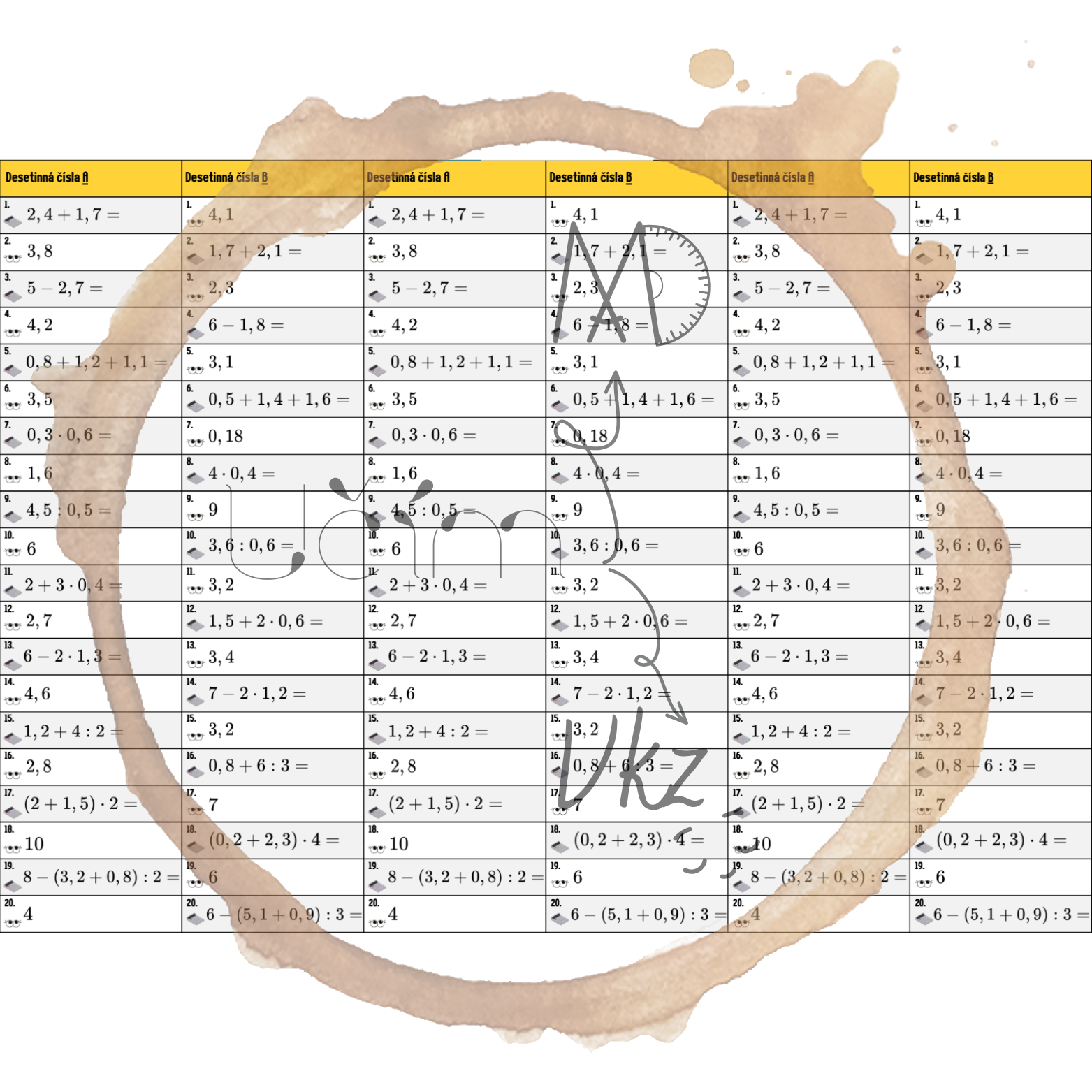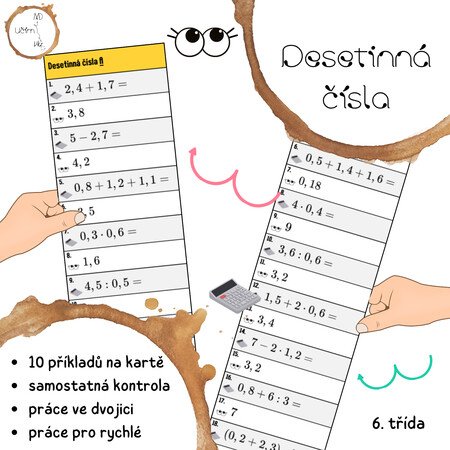 Materiál je primárně pro žáky 6. ročníku ZŠ a slouží k procvičení základních výpočtů s desetinnými čísly. K dispozici jsou dvě karty A a B: