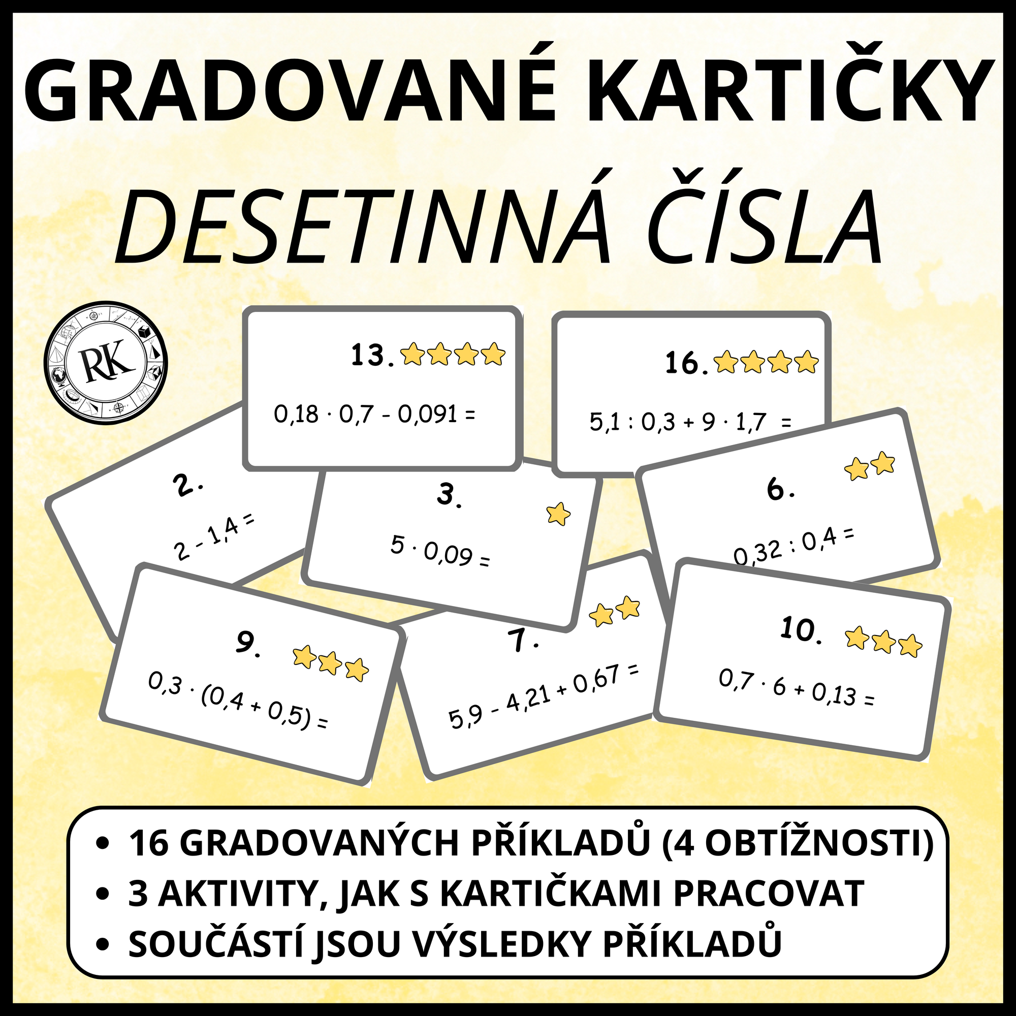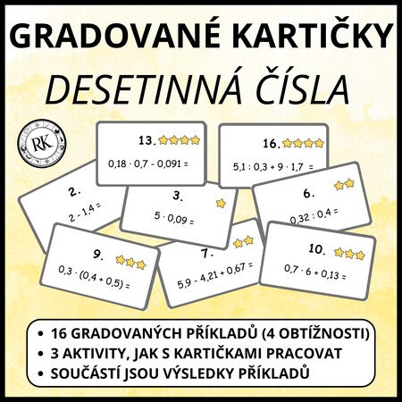Vzdělávací materiál obsahuje 16 kartiček s gradovanými příklady na početní operace s desetinnými čísly a návrhy 3 aktivit, jak s kartičkami pracovat.