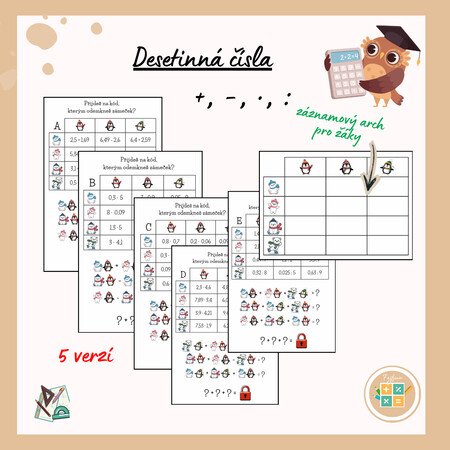 Materiál obsahuje 5 úkolů - A, B, C, D a E, které lze využít během 5 vyučovacích hodin. Úkoly jsou zaměřené na sčítání, odčítání, násobení a dělení desetinných čísel.