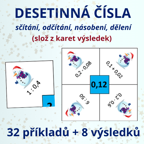 Popis aktivity: Aktivita obsahuje 8 čtveřic karet. Vždy k sobě patří 4 karty se stejným výsledkem. Každá čtveřice obsahuje příklad na sčítání, odčítání, násobení a dělení desetinných čísel.