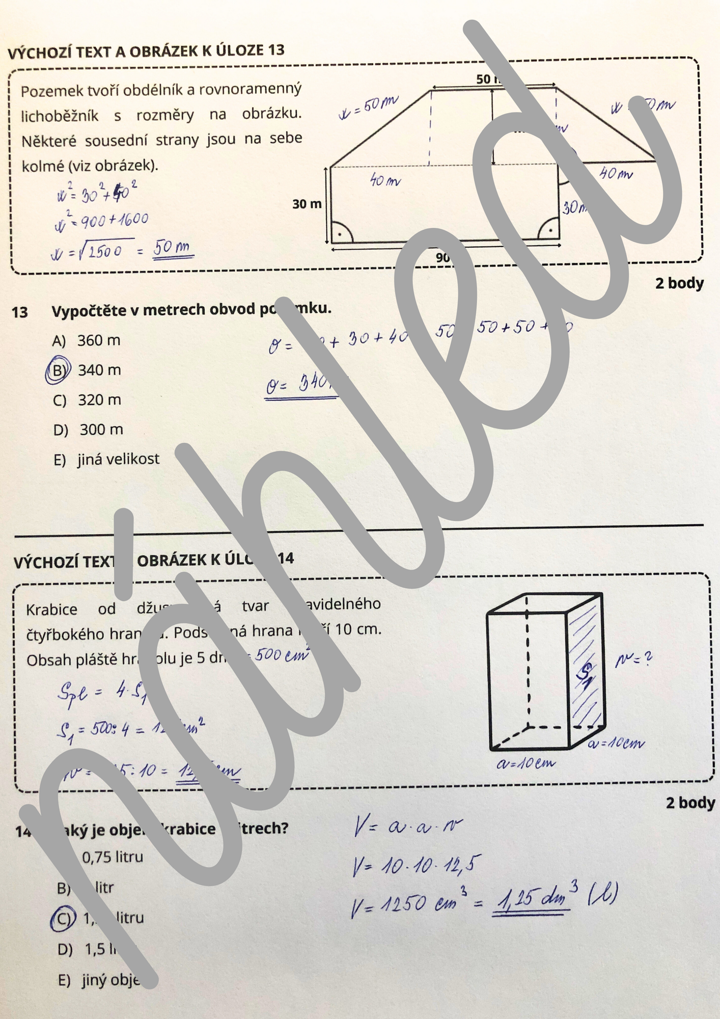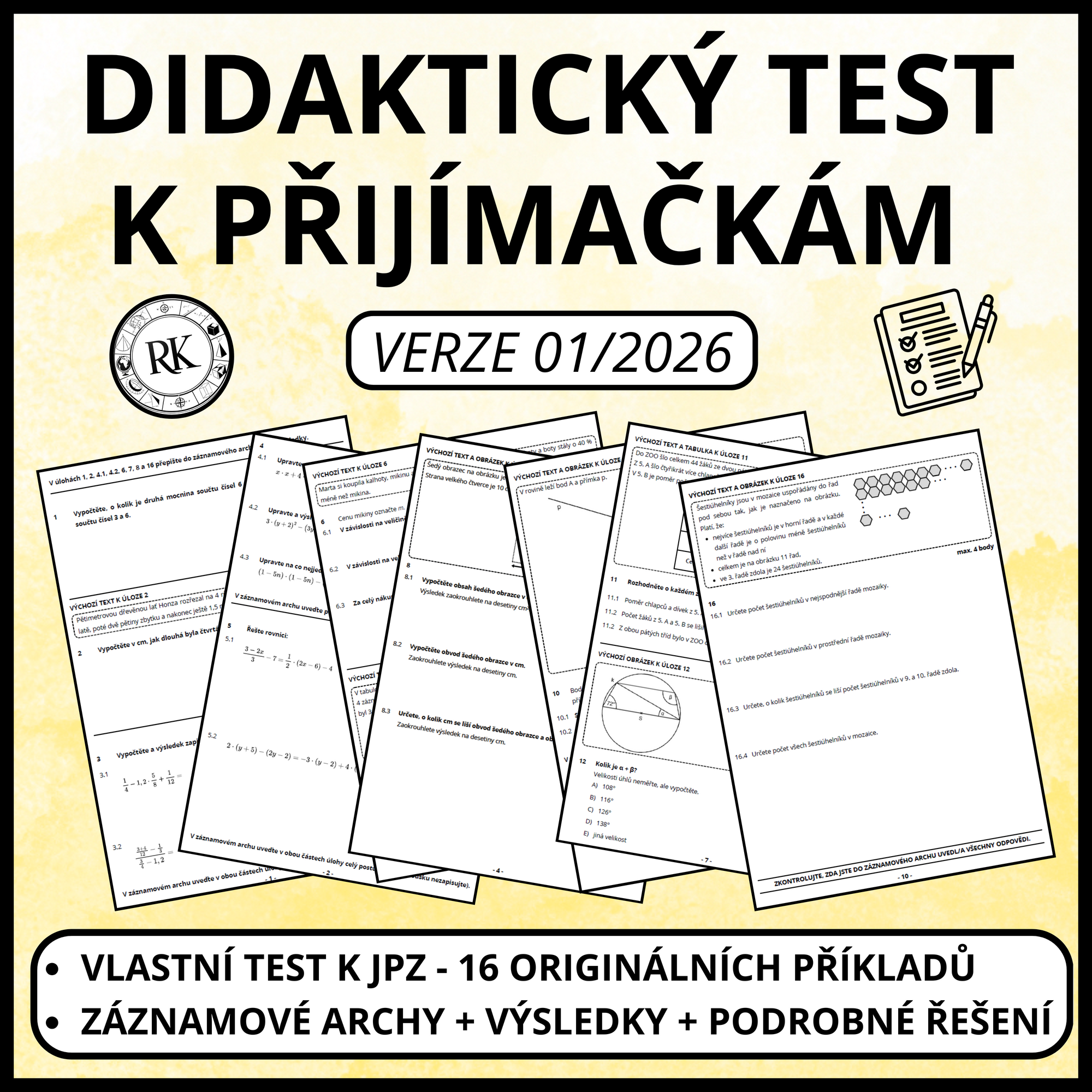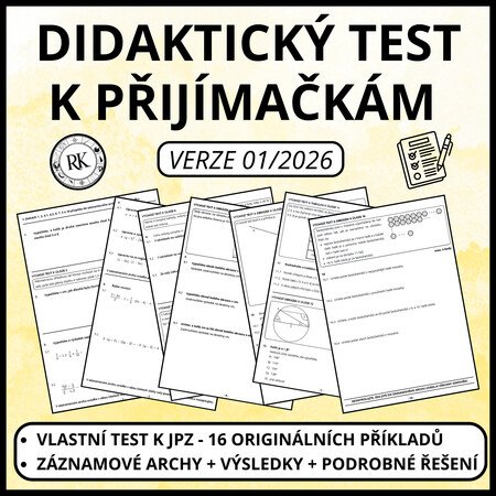 Vzdělávací materiál obsahuje cvičný didaktický test k přijímacím zkouškám z matematiky s vlastními originálními úlohami. Test je sestaven podle vzoru oficiálních testů (počet úloh, témata, body). Součástí jsou pokyny k testu, didaktický test, záznamové archy, klíč správných odpovědí a podrobné řešení všech úloh. Materiál stačí vytisknout a použít.