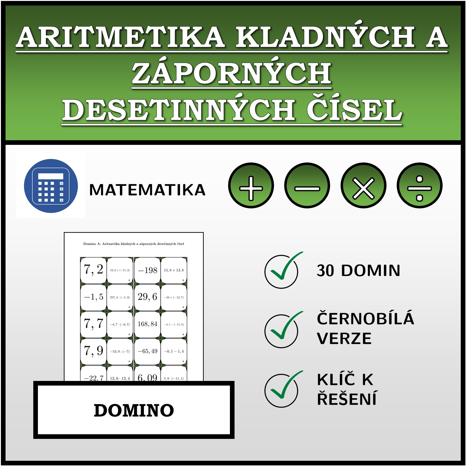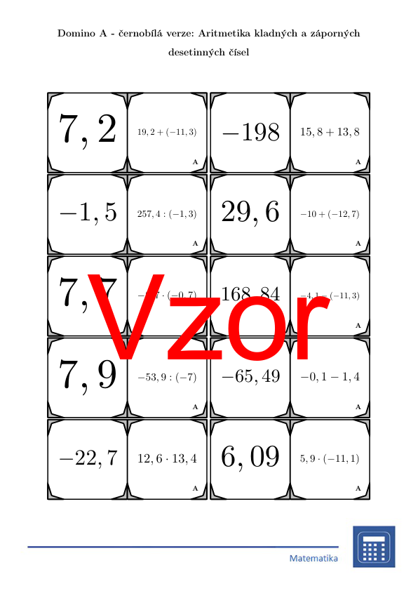 V materiálu se nachází celkem 30 různých sad domin na téma aritmetika kladných a záporných desetinných čísel v následujícím uspořádání: