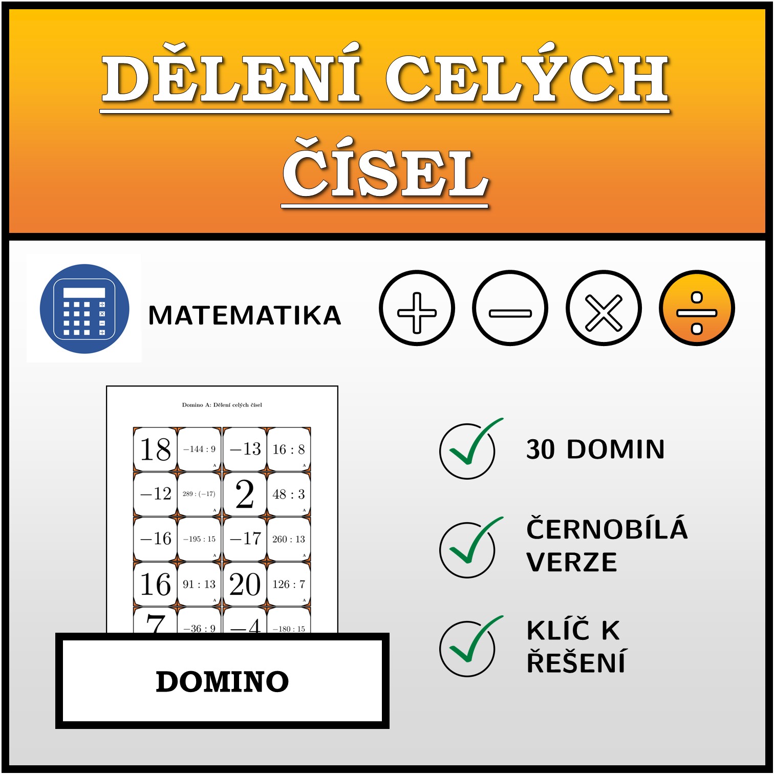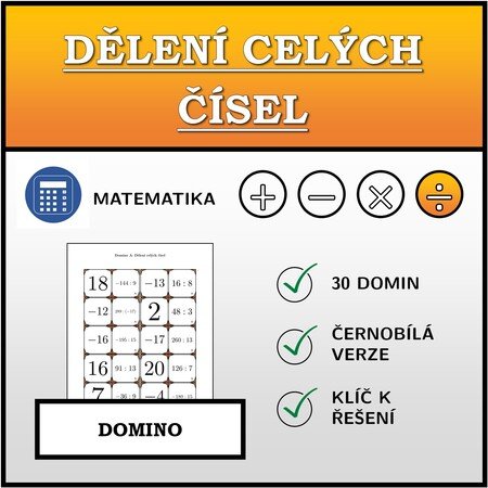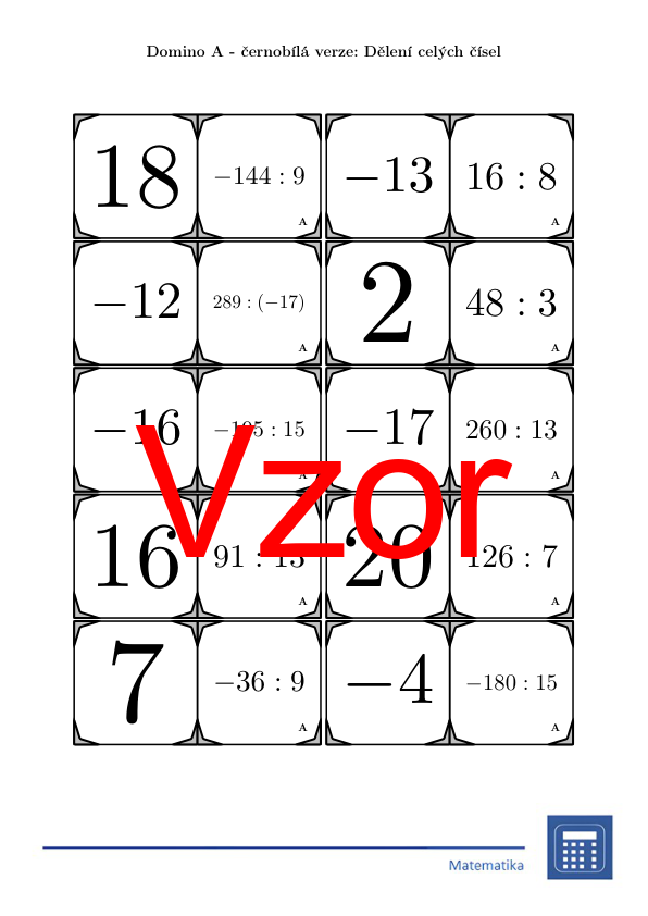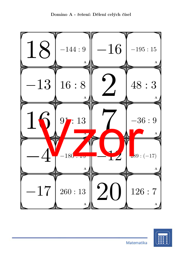 V materiálu se nachází celkem 30 různých sad domin na téma dělení celých čísel v následujícím uspořádání: