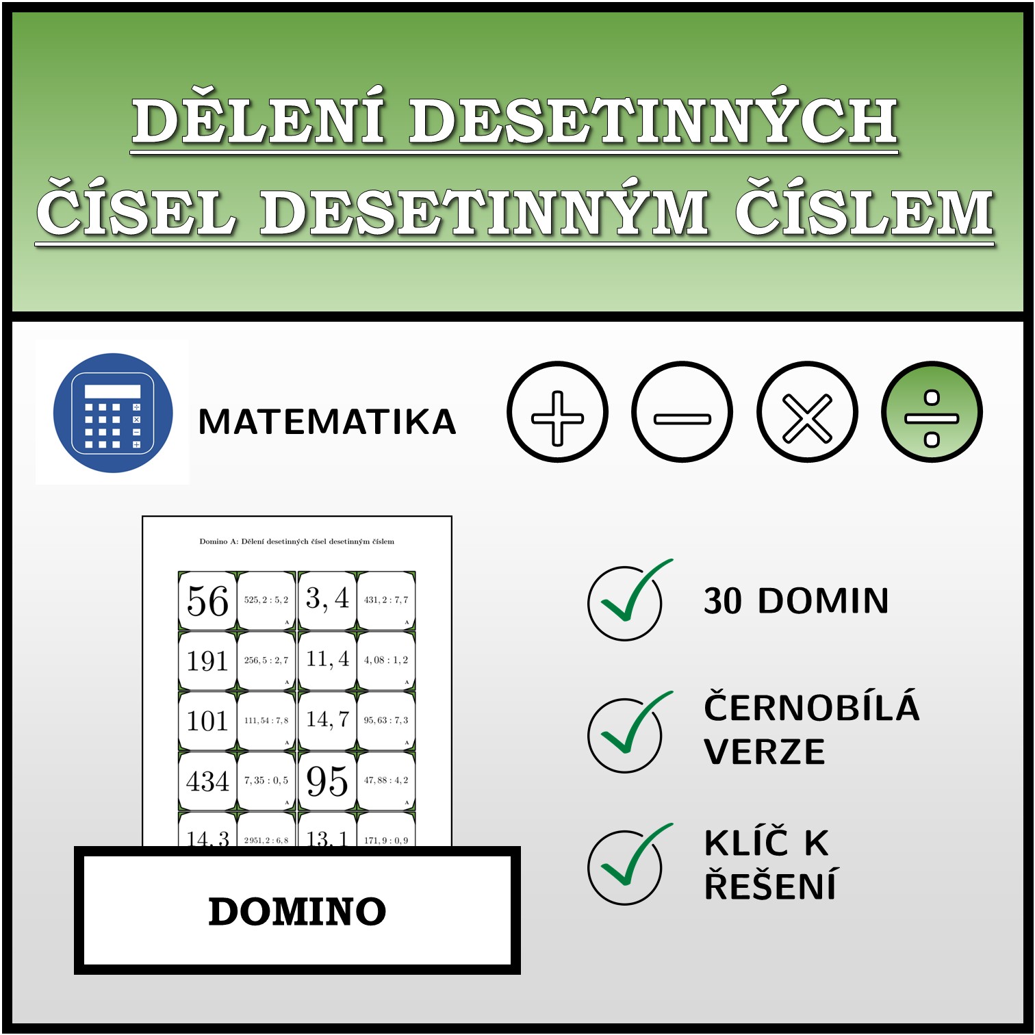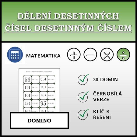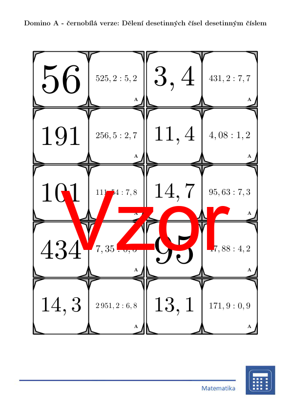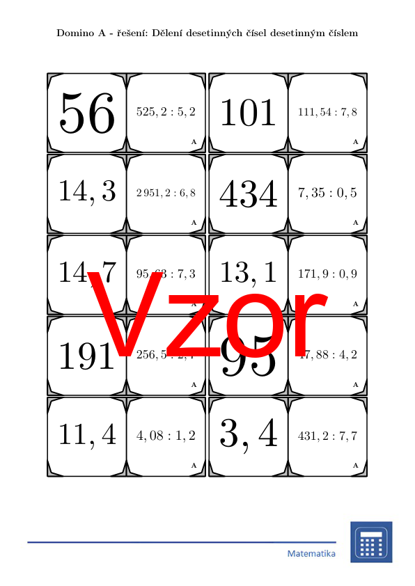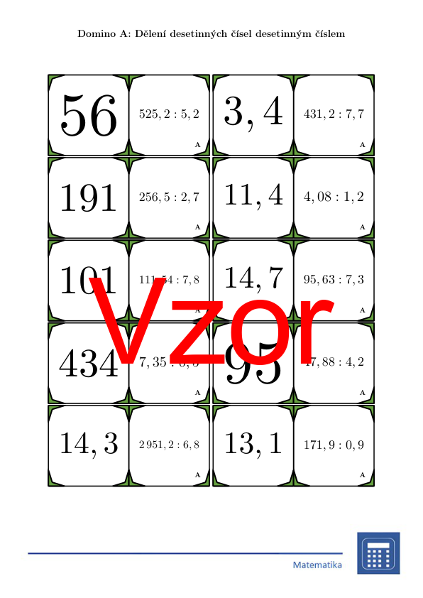V materiálu se nachází celkem 30 různých sad domin na téma dělení desetinných čísel desetinným číslem v následujícím uspořádání: