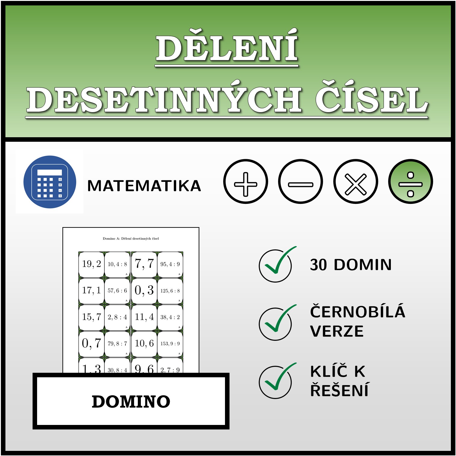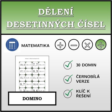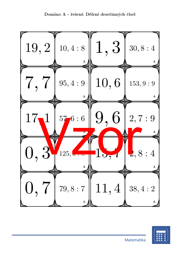 V materiálu se nachází celkem 30 různých sad domin na téma dělení desetinných čísel v následujícím uspořádání: