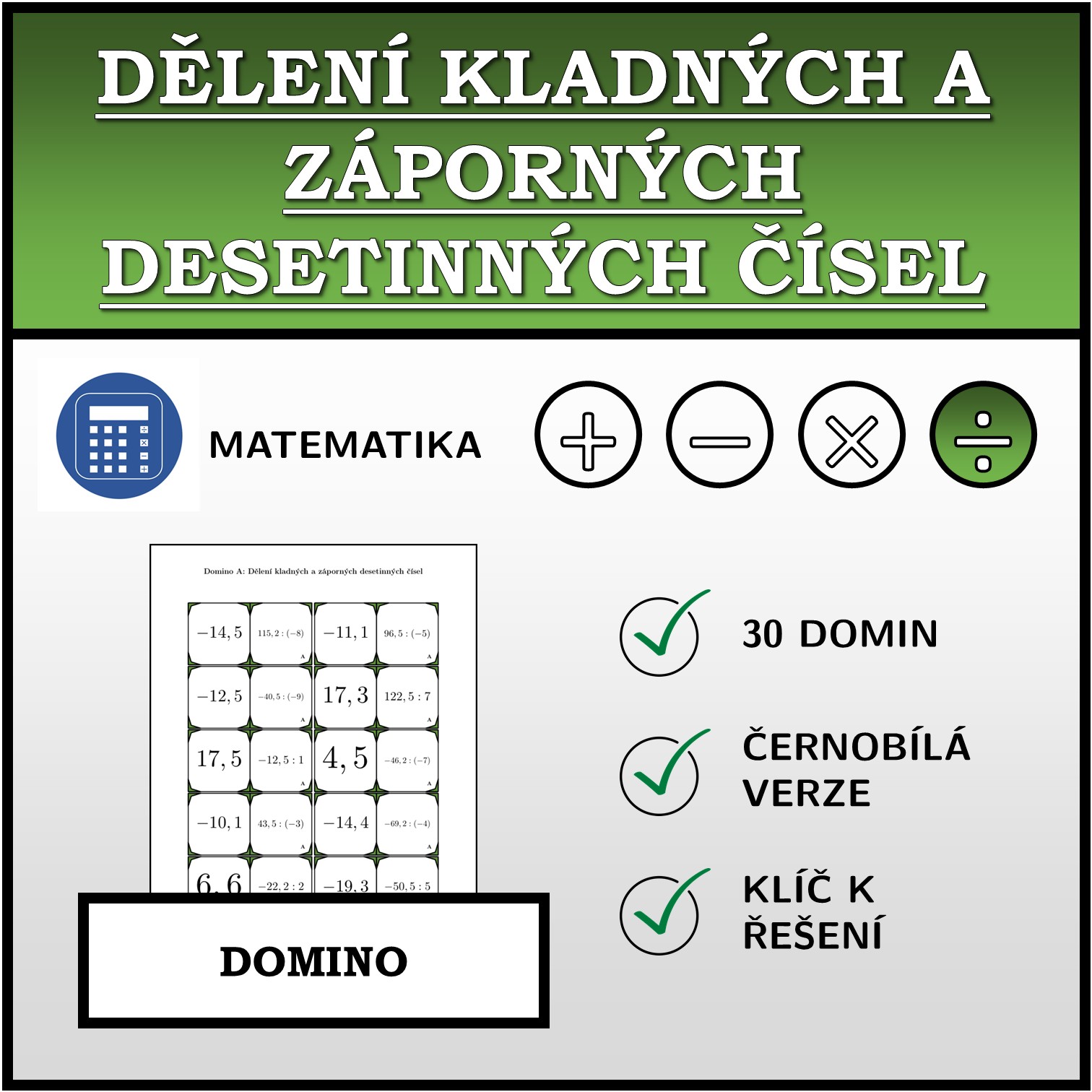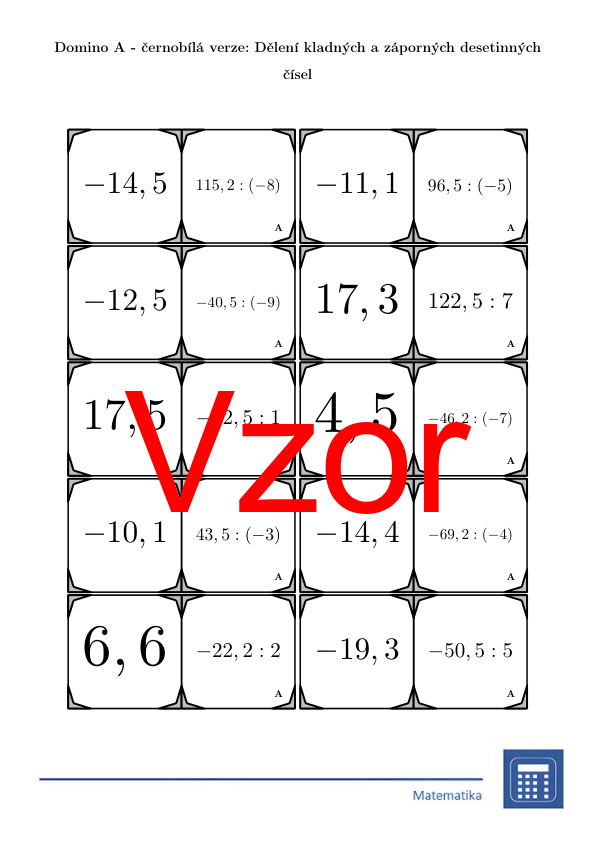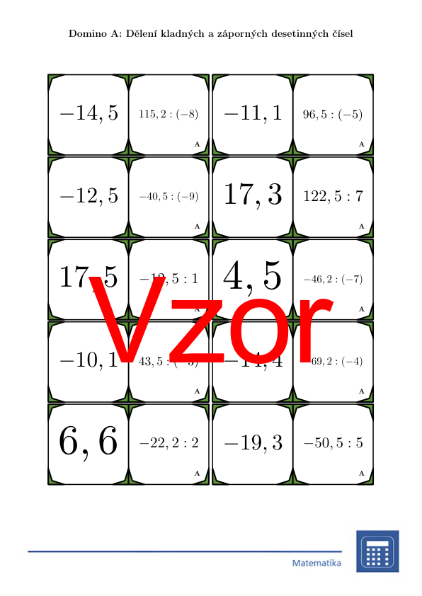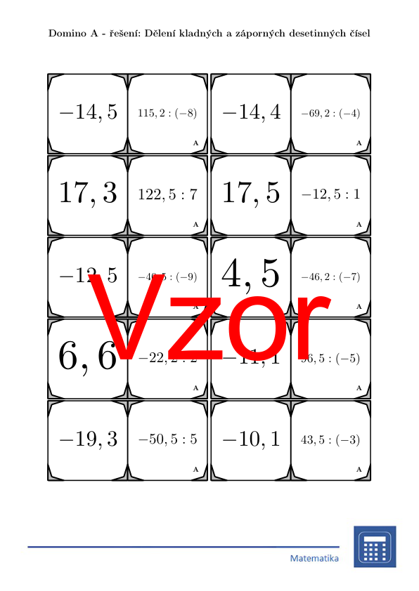 V materiálu se nachází celkem 30 různých sad domin na téma dělení kladných a záporných desetinných čísel v následujícím uspořádání: