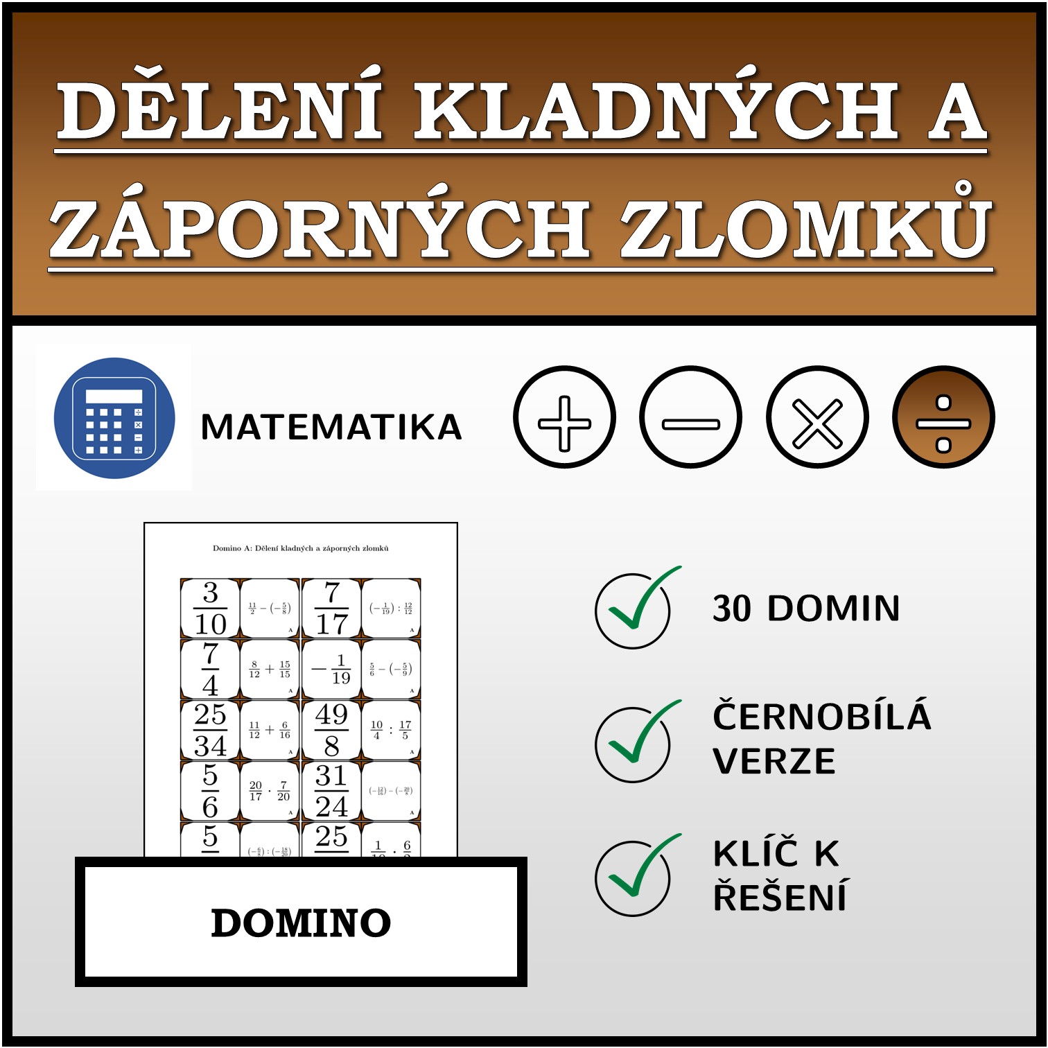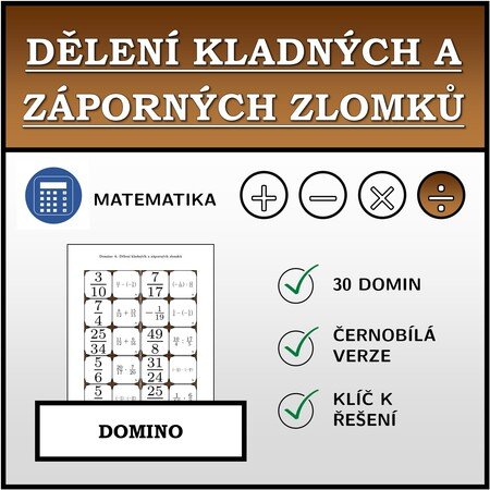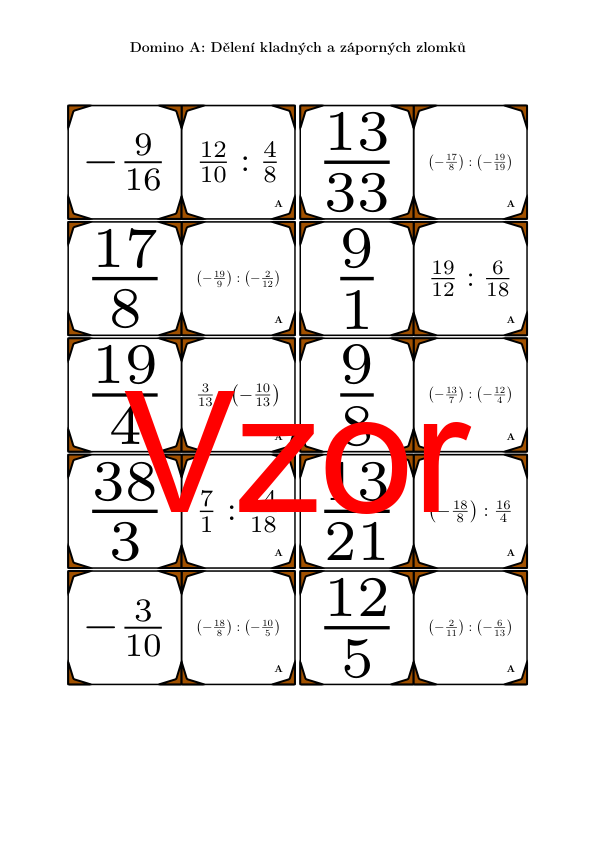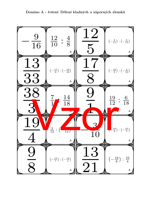 V materiálu se nachází celkem 30 různých sad domin na téma dělení kladných a záporných zlomků v následujícím uspořádání: