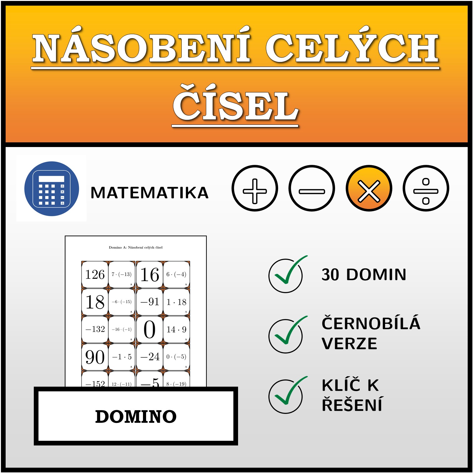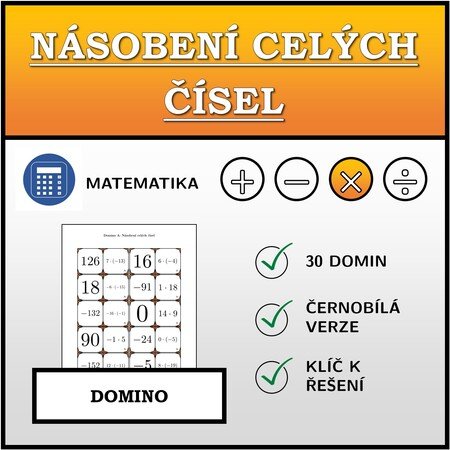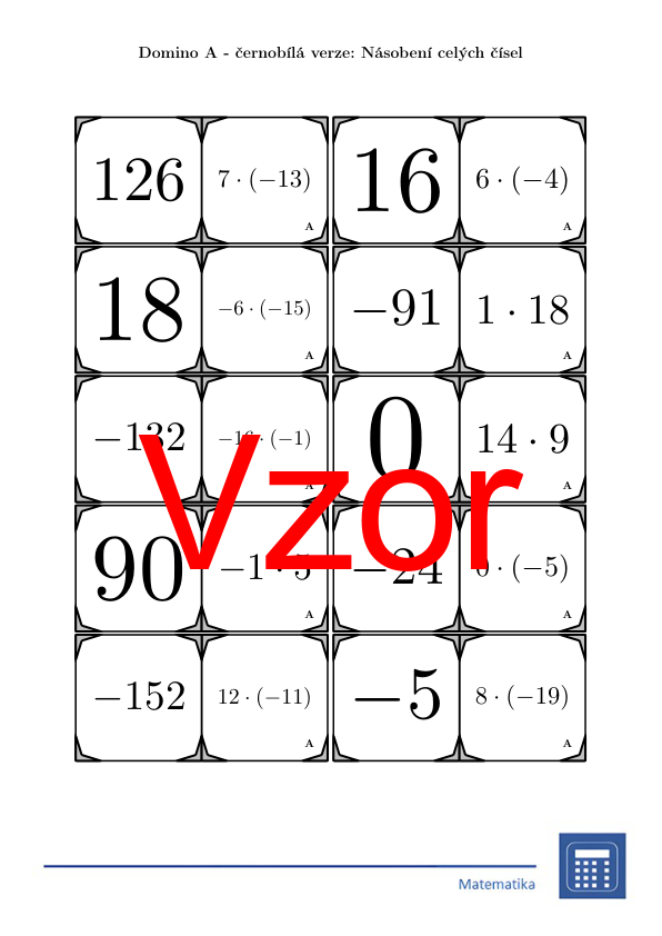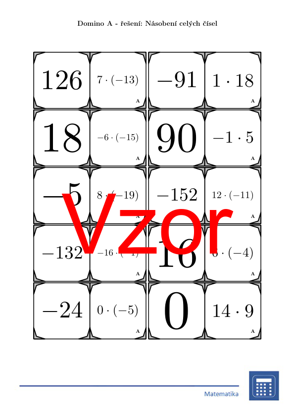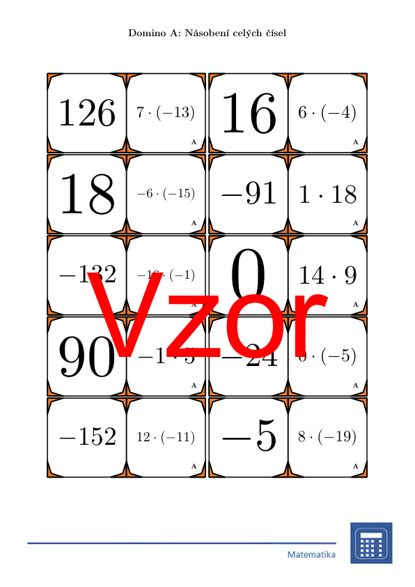 V materiálu se nachází celkem 30 různých sad domin na téma násobení celých čísel v následujícím uspořádání: